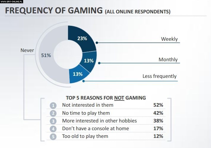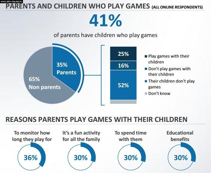 Z badań wynika, że w Polsce 49% respondentów w wieku 16-64 lat grało w ciągu ostatniego roku w grę komputerową. 56% z nich stanowili mężczyźni. Co trzeci mieszkaniec naszego kraju posiadający dostęp do internetu jest zainteresowany grami. Co czwarty rodzić bawi się w ten sposób razem ze swoimi pociechami, a tylko co piąty w ogóle się nie orientuje się w tym, w co grają jego dzieci.
