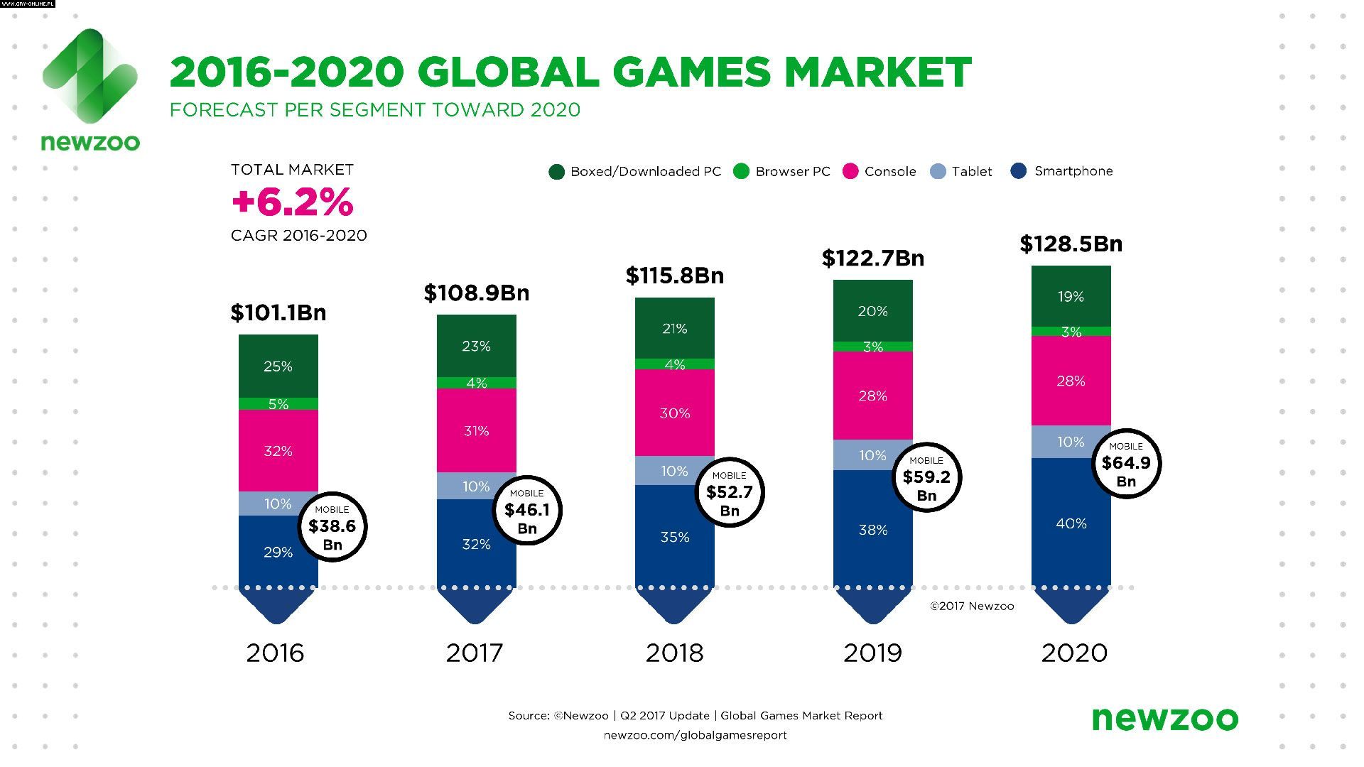 W raporcie można znaleźć również wiele innych ciekawych informacji. Ze 108,9 mld przychodów w 2017 r. aż 94,4 mld przypadnie na segment cyfrowy, zawierający m.in. dystrybucję elektroniczną, mikropłatności i abonamenty. Ponadto w tym roku rynek mobilny ma urosnąć o 19% i trend ten będzie kontynuowany w kolejnych latach. Newzoo przewiduje, że w 2020 roku gry dostępne na smartfony i tablety wygenerują połowę przychodów całej branży.