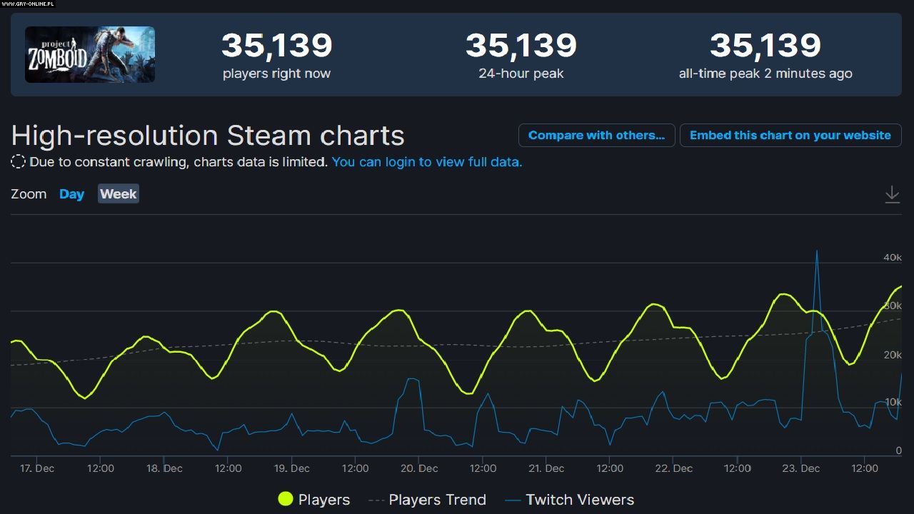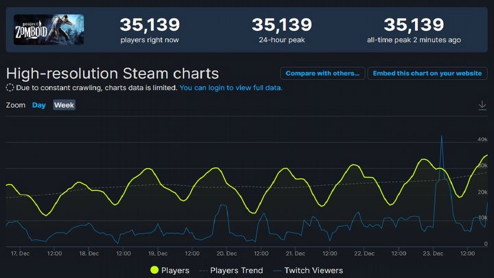 Przyczyn tego trendu należy upatrywać w ogromnej aktualizacji Build 41, która zadebiutowała 20 grudnia i pokryła się z rozpoczętą wczoraj Zimową wyprzedażą na Steamie. W jej ramach Project Zomboid można nabyć za jedyne 36,17 zł.
