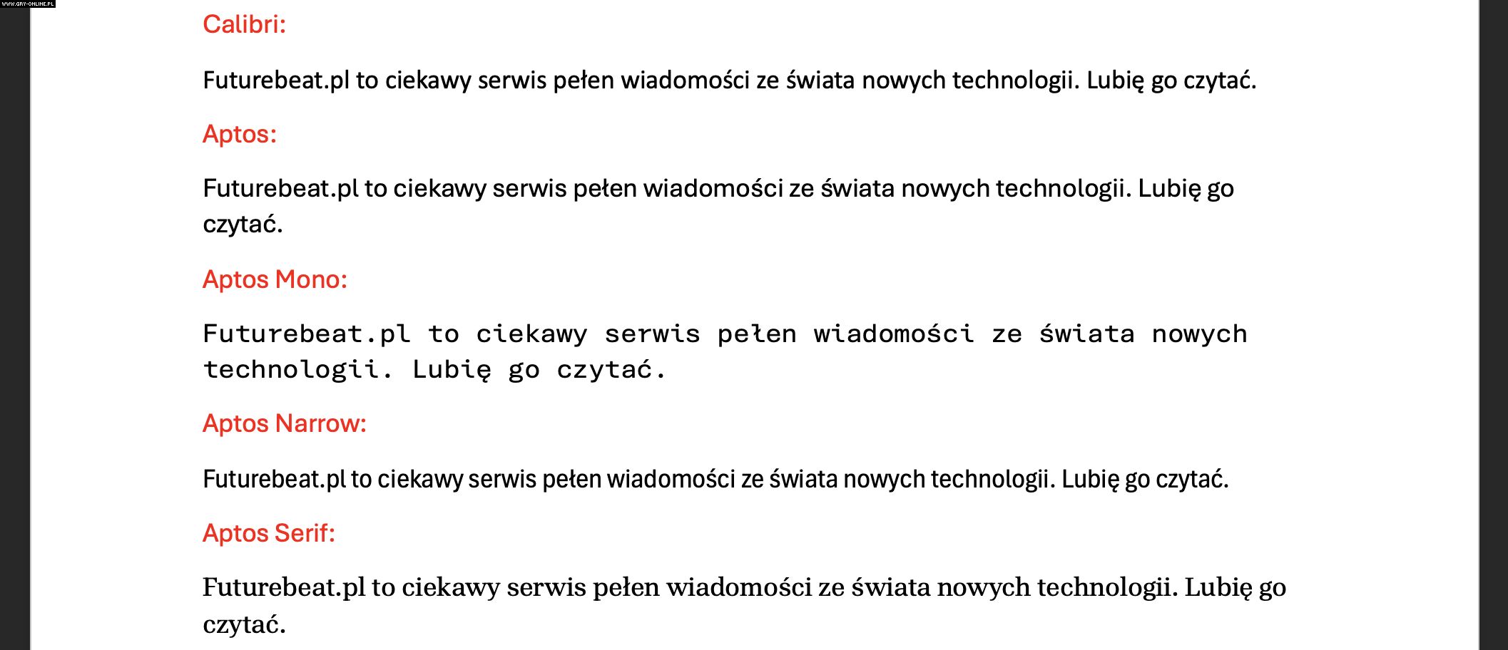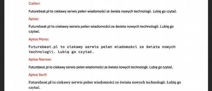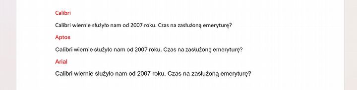 Gdy na salony wkroczyło Calibri, to była prawdziwa rewolucja. Razem z Cambrią fonty odświeżyły oblicze skostniałego i nudnego edytora tekstu. Poprzeczka była więc postawiona bardzo wysoko, ale Aptos chyba nawet się nie starał. A szkoda.
