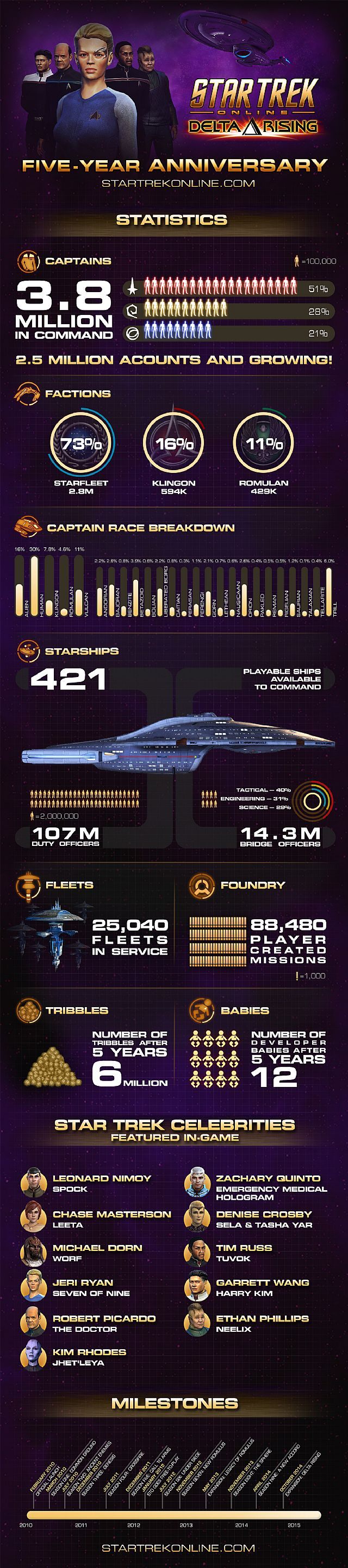 Niedawno swoje 5. urodziny obchodził Star Trek Online. Z tej okazji twórcy gry, Cryptic Studios, przygotowali specjalną infografikę, z której dowiemy się m.in. o całkowitej ilości stworzonych kont (2.5 miliona), najpopularniejszej frakcji (Gwiezdna Flota), najczęściej wybieranej rasie (Ludzie) i wielu innych rzeczach.