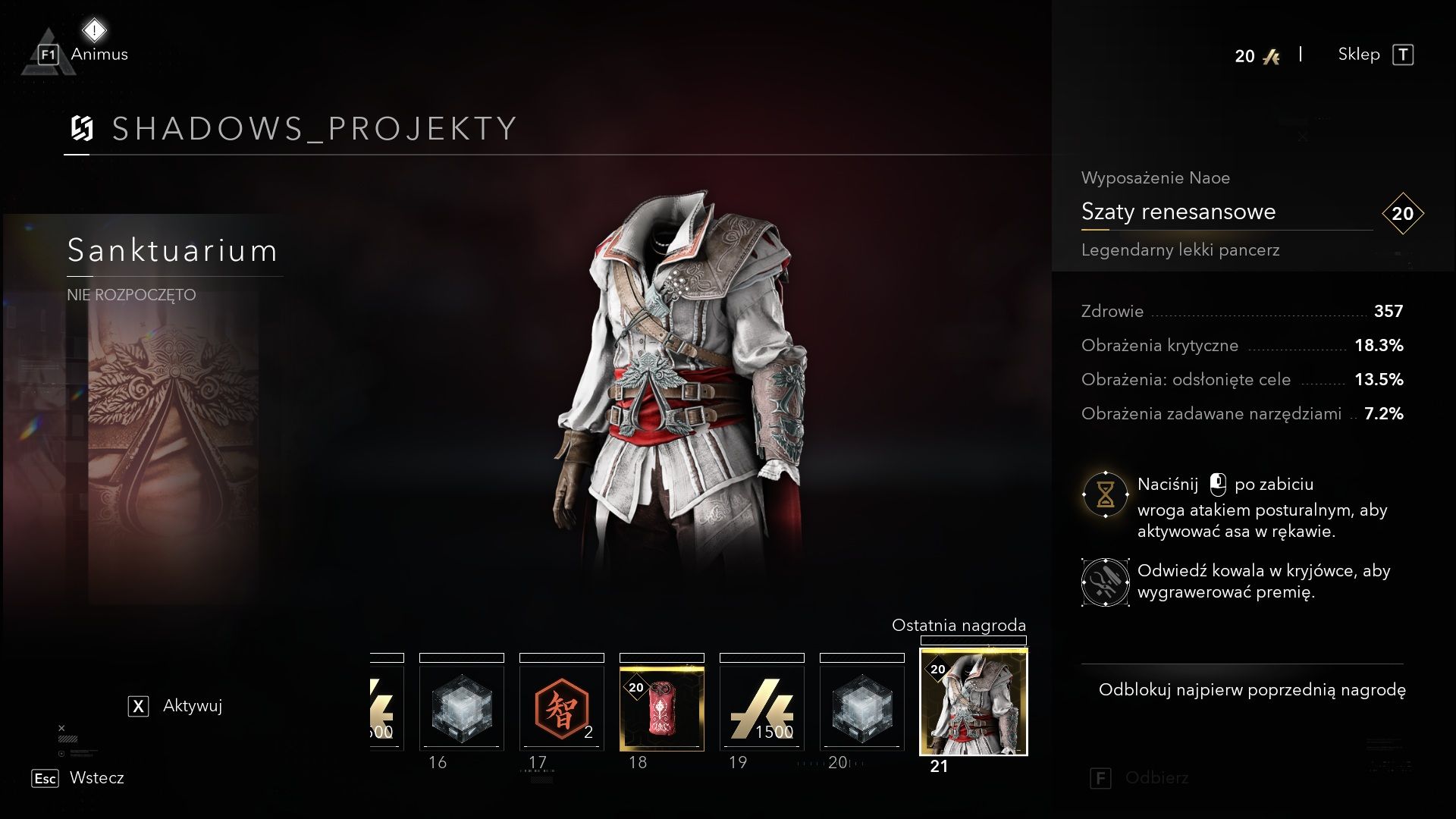 Strój Ezio dla Naoe, a także stylizowane przebranie dla kota w kryjówce, można odblokować w Animus Hub (platforma dostępna jest w menu gry), poprzez wykonanie zadań dostępnych w nowym Projekcie podzielonym na kilkadziesiąt poziomów. Wyzwań, za które otrzymujemy punkty niezbędne do postępu w Projekcie, nie można robić bez przerwy. Da się wykonać tylko kilka zadań w ciągu tygodnia, jako że Ubisoft od premiery AC: Shadows ustawił ich rotację.