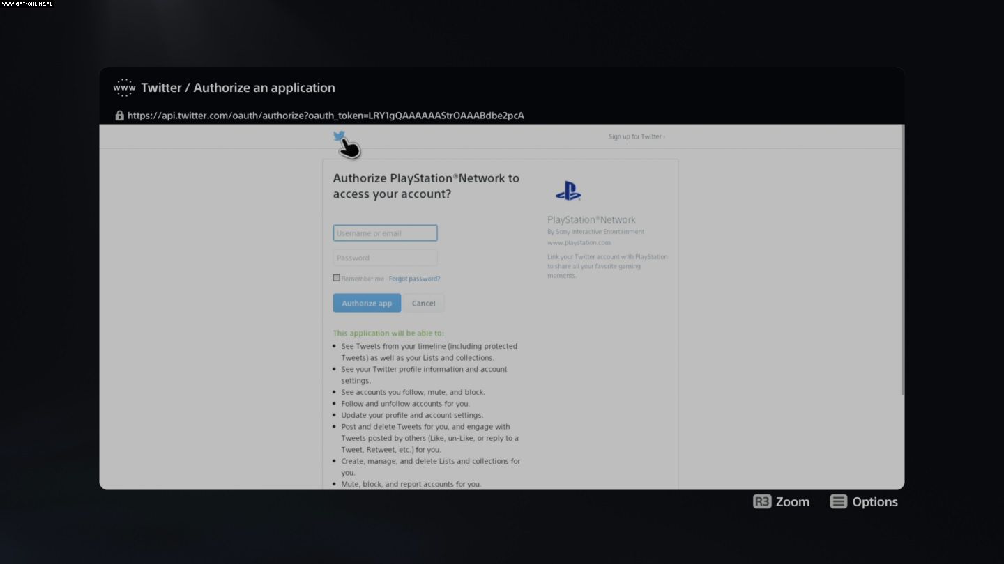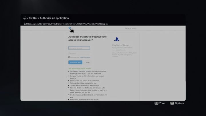 Sposobem na jej uruchomienie podzielił się serwis Ars Technica. Jak się okazuje, bramą do Internetu na PlayStation 5 jest nasze konto w serwisie Twitter, z którym możemy połączyć konsolę. By tego dokonać, musimy przejść do ustawień sprzętu, wybrać opcję „Konta i użytkownicy” (ang. „Users and Accounts”), dalej „Połącz z innymi usługami” (ang. „Link with Other Services”), a następnie połączyć konsolę z twitterowym profilem. Wówczas naszym oczom ukaże się okno logowania do tego serwisu, z którego możemy wyjść, klikając w niewielkie logo Twittera widoczne w lewym górnym rogu ekranu (jak na poniższym obrazku).