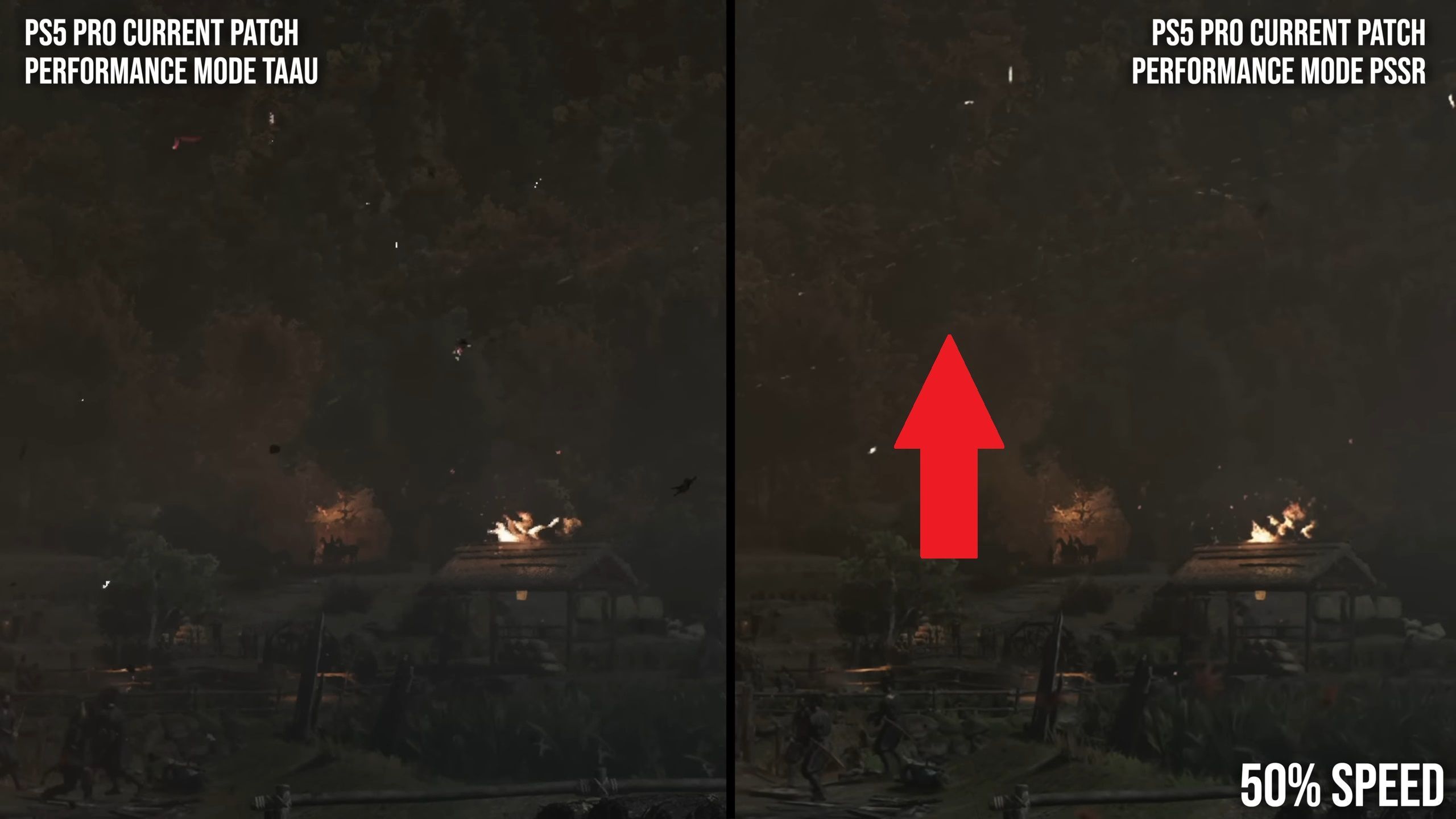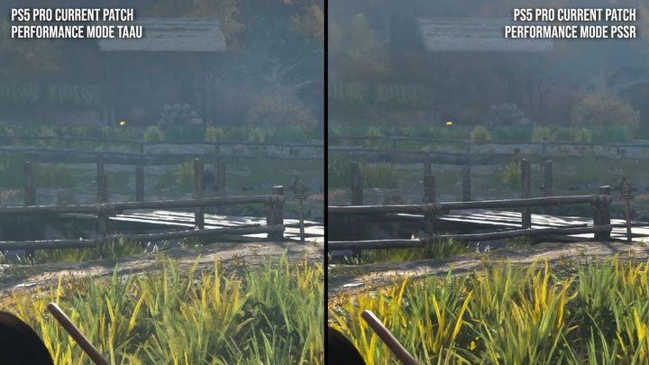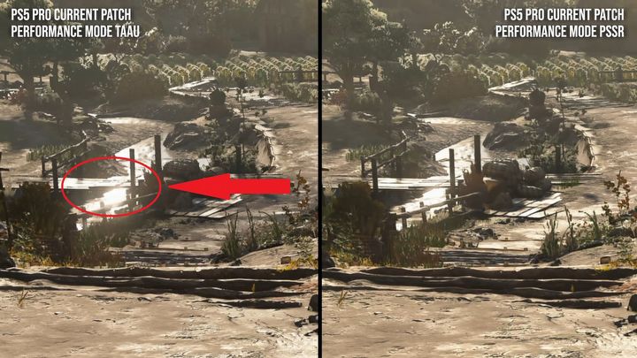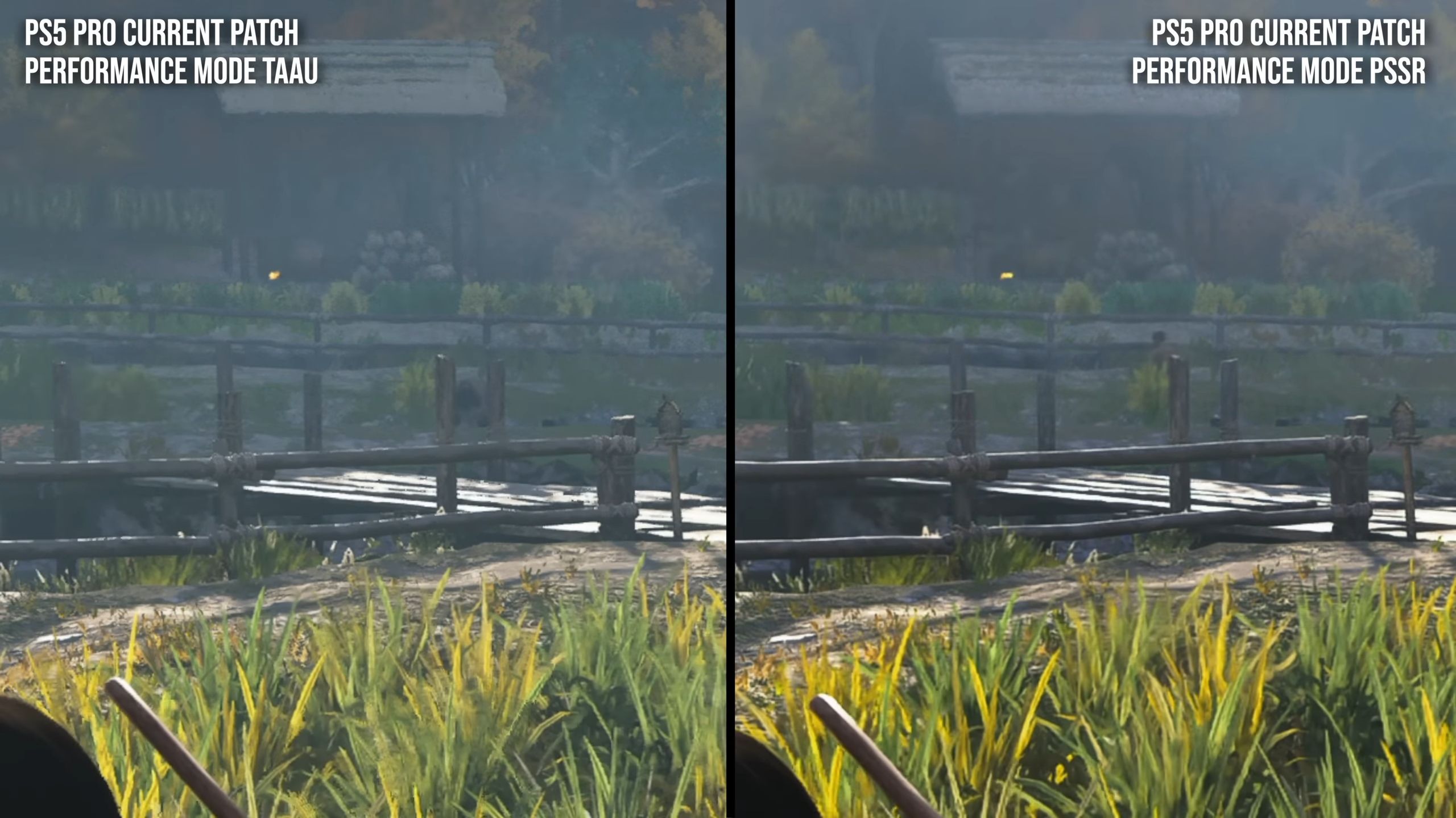 Oliver MacKenzie z Digital Foundry zauważa, że PSSR radzi sobie lepiej z redukcją aliasingu i zachowaniem drobnych detali w oddali, zwłaszcza w statycznych ujęciach. Widoczna jest mniejsza „migotliwość” tekstur podłoża i flory. Porównując oba tryby, PSSR prezentuje obraz bardziej spójny i pozbawiony artefaktów typowych dla TAAU, jak np. rozpadanie się detali czy shimmering (migotanie) na drobnych elementach, takich jak bambusowe łodygi czy poręcza.