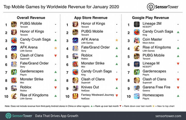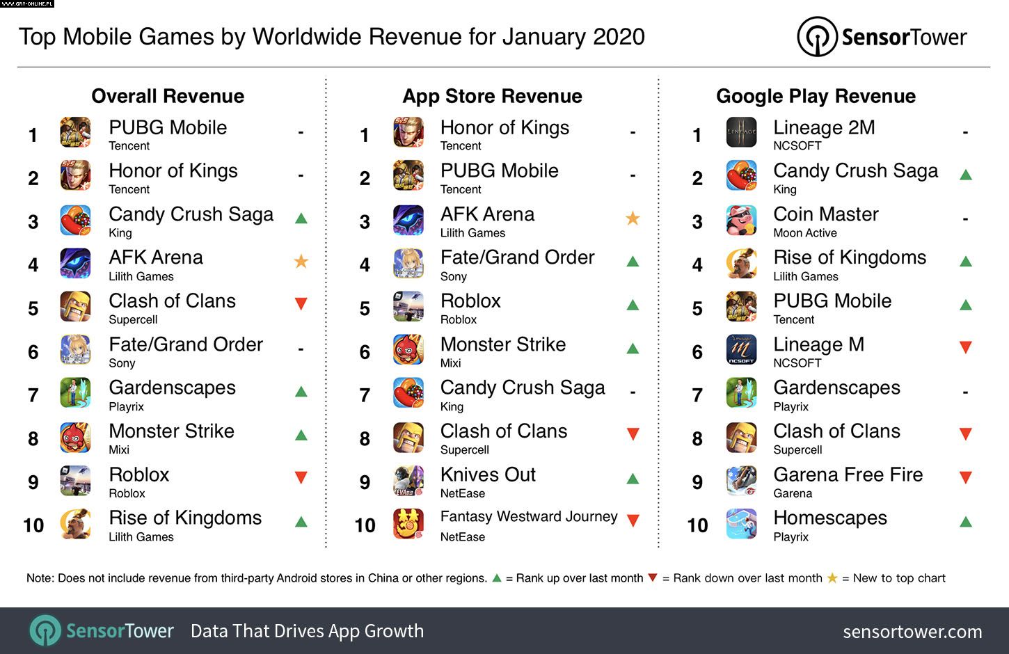 Na drugim miejscu znalazło się Honor of Kings z zarobkiem na poziomie 151,3 mln dolarów. Aż 94,6% tej kwoty pochodzi od graczy z Chin. Natomiast premiera produkcji AFK Arena w Chinach przyczyniła się do ogromnego skoku w jej dochodach – w styczniu zarobiła 88,3 mln dolarów (co jest wynikiem prawie trzykrotnie większym od jej najlepszego miesiąca w 2019 roku).
