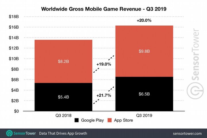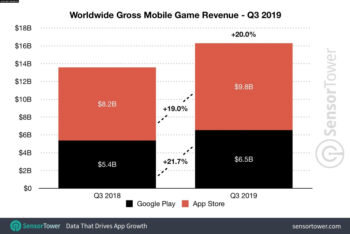 Według informacji podanych przez portal SensorTower, całkowity globalny przychód brutto z gier mobilnych wzrósł o 20% (16,3 mld dolarów) w porównaniu do trzeciego kwartału poprzedniego roku (13,6 mld dolarów). Najwięcej pieniędzy wydali użytkownicy App Store – 9,8 mld dolarów – a gracze korzystający z Google Play 6,5 mld dolarów.