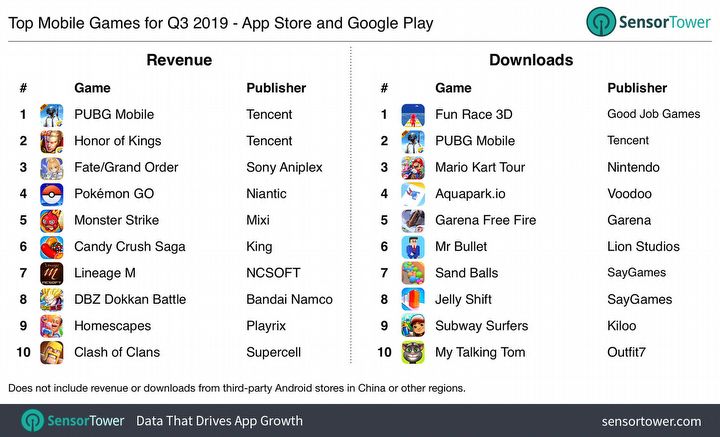 Grą z największą liczbą pobrań w trzecim kwartale 2019 roku jest Fun Race 3D (123 mln). Tuż za nią uplasowało się PUBG Mobile, a na trzecim miejscu niedawno wydane Mario Kart Tour, które w ponad tydzień pobrano aż 90 mln razy.