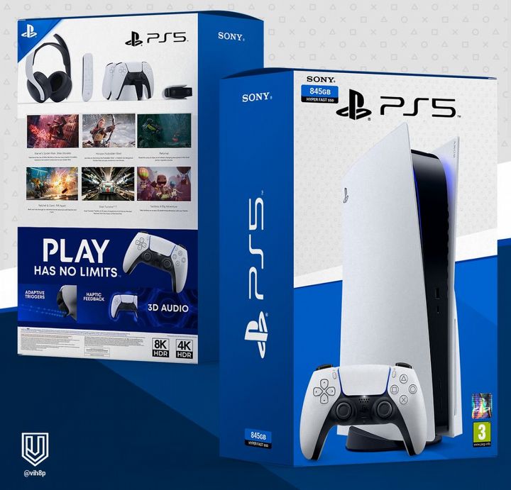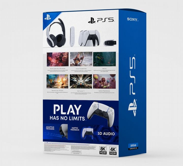 Twórca obrazków nie ustrzegł się niewielkiego błędu – na pudełku widnieje informacja o dysku SSD o pojemności 845 GB, podczas gdy nośnik PS5 będzie oferował o 20 GB przestrzeni mniej. Mimo tej wpadki warto odnotować przywiązanie do detali – np. podkreślenie dźwięku 3D na tyle pudełka czy wykorzystanie hasła „Play Has No Limits”.