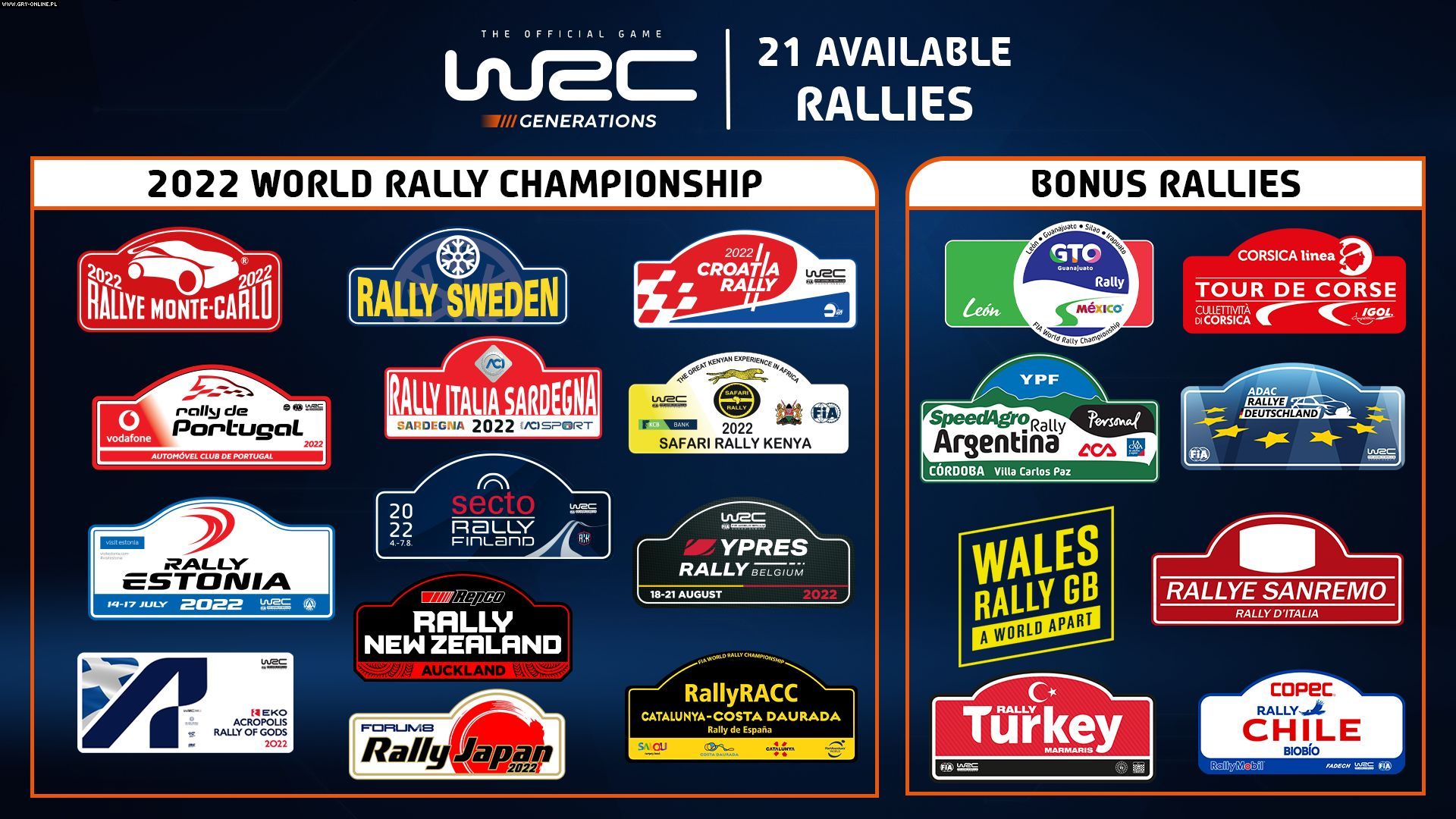 Jak widzicie, Włochy występują podwójnie – należałoby więc powiedzieć, że w WRC Generations znajdzie się „tylko” 20 krajów. To jednak nadal liczba robiąca wrażenie, zwłaszcza na tle konkurencji w postaci DiRT Rally 2.0, które na start miało zaledwie 6 państw (drugie tyle doszło w DLC).