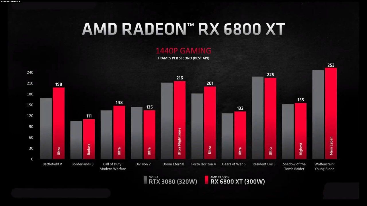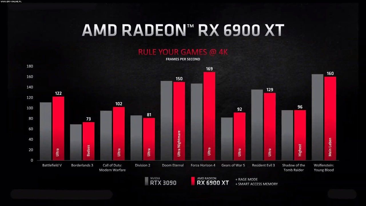 Do rzeczy: RX 6800 XT wypada w niektórych grach wyraźnie lepiej niż RTX 3080 (m.in. Battlefield V, Wolfenstein: Youngblood), a w innych gorzej (np. remake Resident Evil 3), RX 6800 odskakuje RTX 2080 Ti, a zatem także RTX 3070, natomiast najmocniejszemu układowi RX 6900 XT zdarza się wyraźnie prześcignąć RTX 3090 (np. w Forza Horizon 4, Call of Duty: Modern Warfare, Battlefield V), ale też czasem ustąpić konkurencyjnemu modelowi (chociażby w Wolfenstein: Youngblood i remake’u Resident Evil 3).