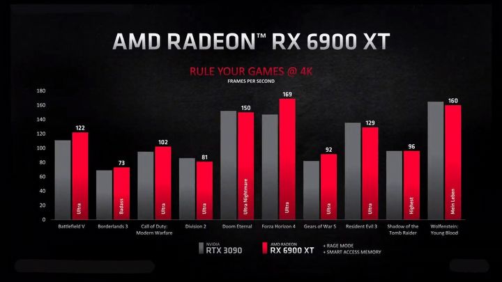 Trzeba mieć na uwadze, że na wykresach widnieje wzmianka o aktywacji Smart Access Memory i ew. trybu Rage (OC za pomocą jednego przycisku w aplikacji), które zwiększają wydajność, zwłaszcza w połączeniu z procesorami Ryzen 5000 (testy, których wyniki widzicie powyżej, wykonano na Ryzenie 9 5900X). AMD zaprezentowało więcej ciekawych rozwiązań pokroju Anti-Lag czy Boost, które zredukują opóźnienia w grach sieciowych (odpowiedź na Nvidia Reflex?). Zestaw narzędzi AMD FidelityFX, który znany jest deweloperom od dłuższego czasu, poszerzy się o nowości pokroju Super Resolution, odpowiednika techniki DLSS. Nie będzie on jednak dostępny zaraz po premierze Radeonów RX 6000 i według serwisu The Verge może pojawić się także na konsolach PS5 i Xbox Series X.