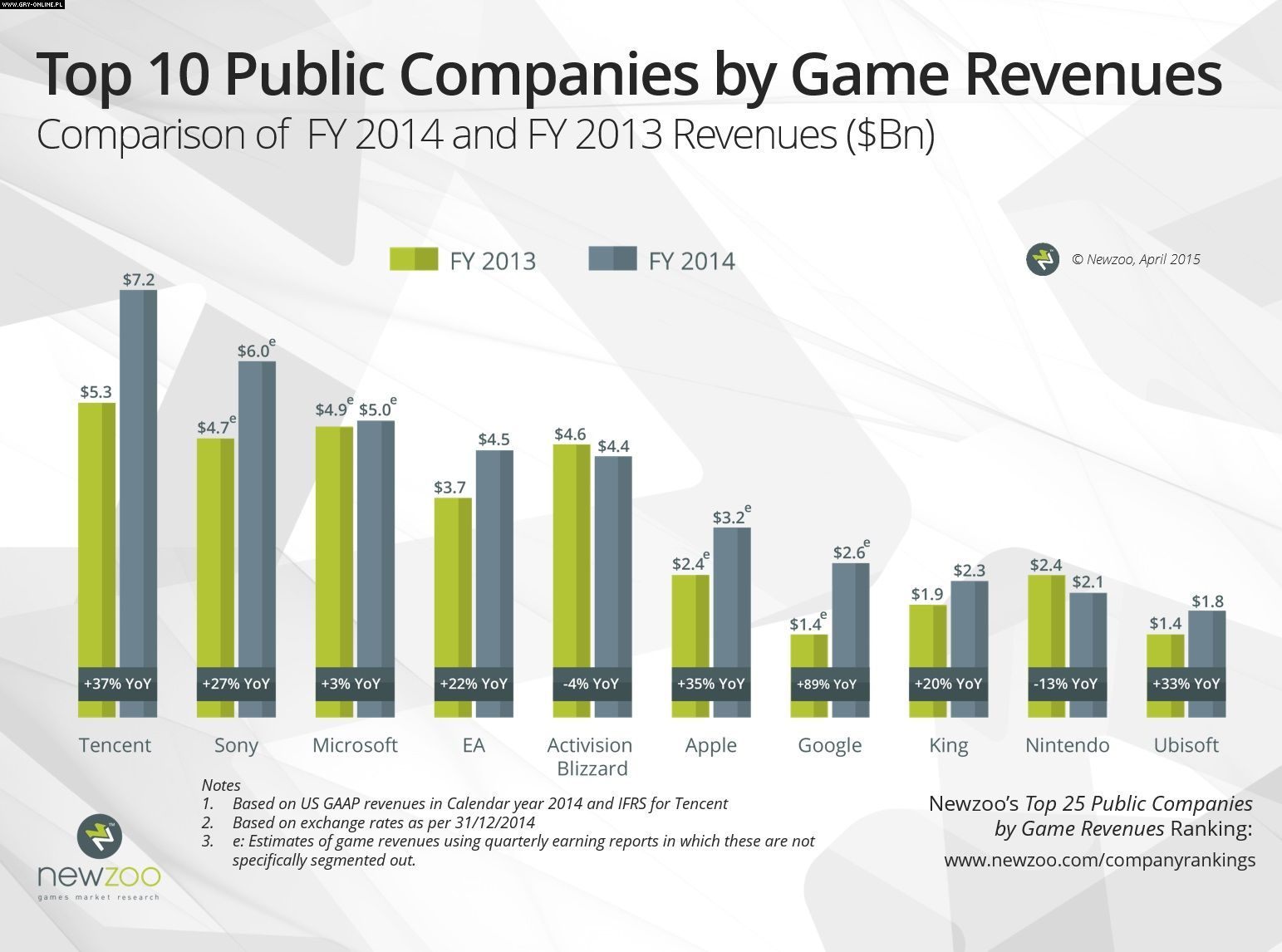 Firma Newzoo, opierając się na oficjalnych wynikach finansowych, przygotowała raport dotyczący wartości branży gier wideo w 2014 roku. Rynek zaliczył 10% wzrost, a firmą z największym przychodem okazał się chiński gigant Tencent, który pokonał Sony i Microsoft.