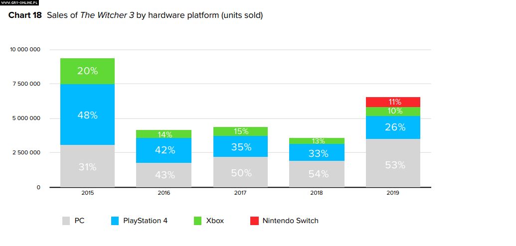 Za ogromne wzrosty przychodów CD Projektu odpowiada w dużej mierze... pięcioletni już Wiedźmin 3: Dziki Gon. Jesienią gra zadebiutowała bowiem na świetnie sprzedającej się konsoli Nintendo Switch, a także niespodziewanie znalazła się ponownie na listach bestsellerów na komputerach PC. Skokowy wzrost zainteresowania serią był w dużej mierze wynikiem premiery telewizyjnego serialu Netfliksa. Co ciekawe, aż ponad połowa sprzedanych kopii Wiedźmina 3 w 2019 roku została zakupiona na pecetach, a więc więcej niż na wszystkich trzech pozostałych platformach razem wziętych. Szefostwo CD Projektu podkreśla, że na zwiększone przychody wpłynęła również premiera Gwinta na urządzeniach z systemami iOS.