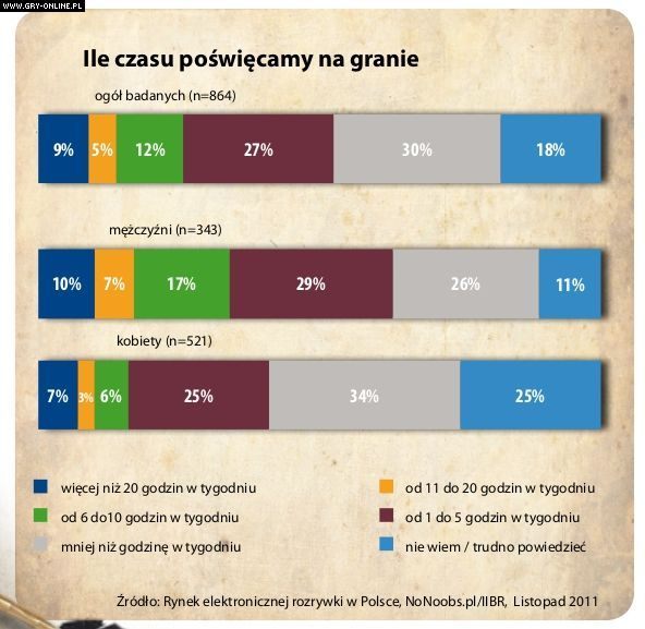 Kontynuujemy cykl artykułów przedstawiających najciekawsze informacje o polskim rynku gier wideo zawarte w Raporcie Game Industry Trends 2011. Tym razem przyglądamy się wynikom badań przeprowadzonych przez Interaktywny Instytut Badań Rynkowych na zlecenie firmy Nonoobs.pl dotyczących częstotliwości i ilości czasu poświęcanego na gry wideo.