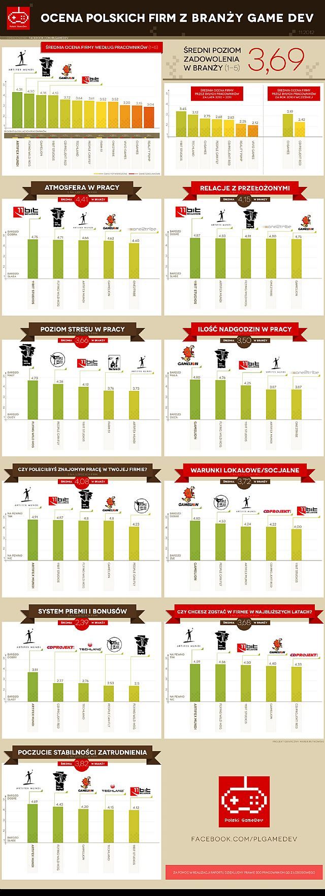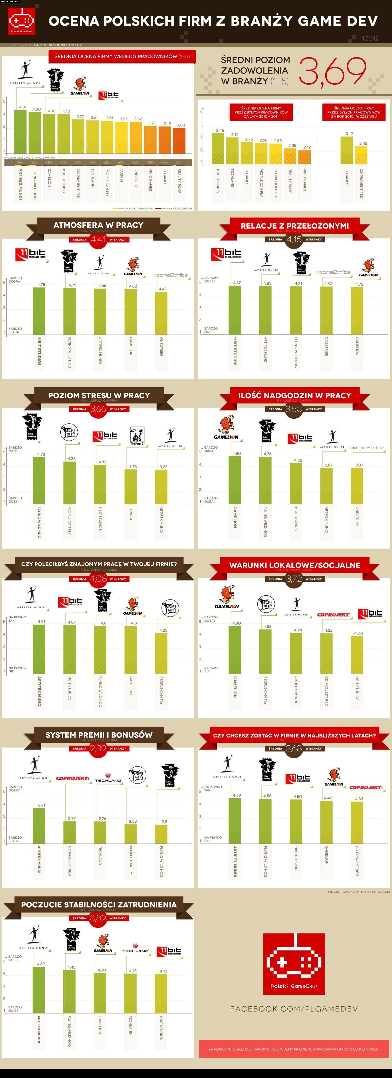 Artifex Mundi, Flying Wild Hog oraz Gamelion to najlepiej oceniane przez pracowników polskie studia. Pierwszy z producentów, mający siedziby w Zabrzu i Krakowie, zajął czołowe miejsca także w kategorii systemu premii i bonusów, czy stabilności zatrudnienia. Artifex Mundi jest firmą, w której poziom i liczba nadgodzin są stosunkowo niskie (w ocenie samych pracowników). Pełne zestawienie wyników znajdziecie na poniższej grafice.