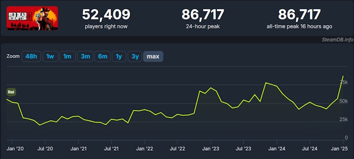 Rekord aktywności udało się ustanowić wczorajszego popołudnia. Wówczas w szczytowym momencie w RDR 2 grało jednocześnie 86 717 graczy na Steamie (via SteamDB). Tym samym udało się przebić wynik osiągnięty w listopadzie 2023 roku, kiedy to w grze bawiło się naraz około 77 tysięcy osób.