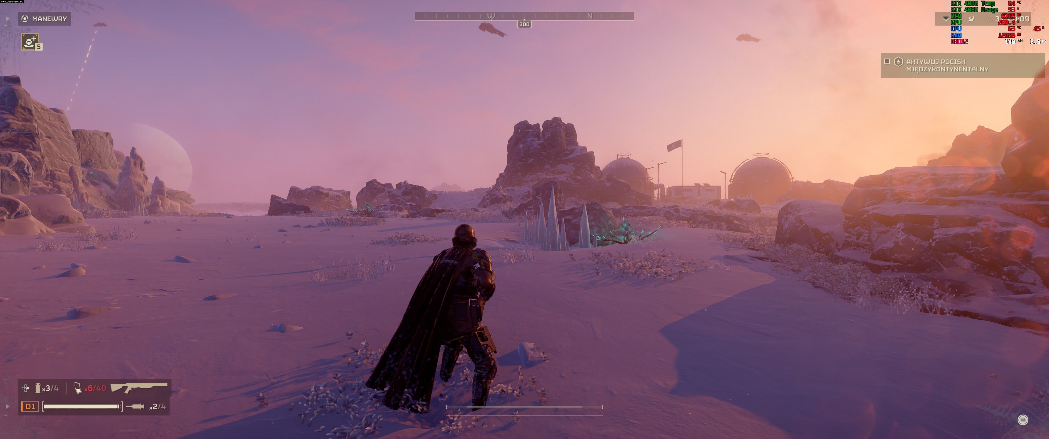 Jeśli chodzi o tryb wydajności, to na telewizorze 4K wydaje się on działać w okolicy 1080p z dość agresywnym upscalowaniem do 4K. W opcjach można dodatkowo włączyć antyaliasing oraz wyostrzanie, co polecam zrobić, bo bez tego Helldivers 2 wygląda dość „miękko”. Gra trzyma 60 fps w spokojniejszych sekcjach eksploracji i walki, ale w trakcie starć na dużą skalę zdarza się jej spaść do 53-54 klatek na sekundę, co można odczuć. Nie są to na szczęście spadki długotrwałe i bardzo przeszkadzające, ale warto mieć je na uwadze.