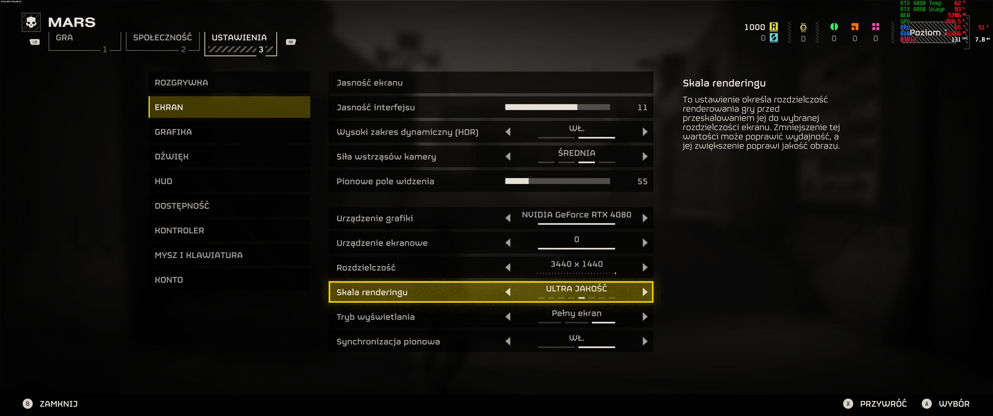 Co ciekawe, nawet na GTX-ie 1660 Super gra działała płynnie. Na ustawieniach średnich w 1080p Helldivers 2 trzymało około 60 fps ze spadkami do 53-55 klatek. Dla zapewnienia stałych 60 fpsów wystarczy włączyć upscaling w trybie ultra jakości.