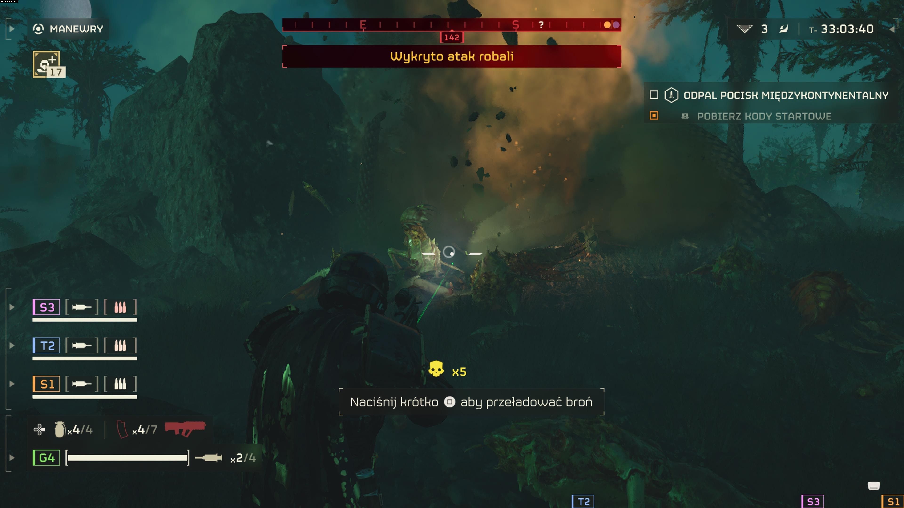 Ostatnim elementem, na który muszę zwrócić uwagę jest to, w jaki sposób animowane są walki. Przypomina mi to „mięsistość” strzelania, którą ostatni raz tak dobrze oddawał Doom Eternal. W Helldivers 2 każdy nabój ma wagę i sieje spustoszenie. Strzelanie do wrogów sprawia mnóstwo satysfakcji i frajdy, głównie przez to, że czuć po prostu moc tych strzałów. Każdemu pociskowi, który trafi we wroga towarzyszy odpowiedni efekt wizualny (np. rozbryzg mazi, krwi, odpadające fragmenty łuskowatych pancerzy czy opiłki metalu) oraz dźwiękowy (słychać soczyste wbijanie się kuli w cel). Na dodatek nasze działanie ma realne przełożenie na to, co widać na ekranie. Jeśli strzelimy w nogę owada, to może ona odpaść, jeżeli przycelujemy w mechaniczne ramię, to robot pewnie je straci, itd.