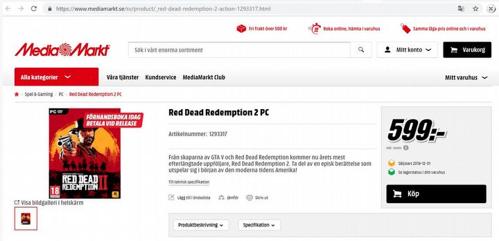 Zamówienie przedpremierowe pecetowego Red Dead Redemption 2 na szwedzkiej stronie Media Markt [źródło: TechTastic]