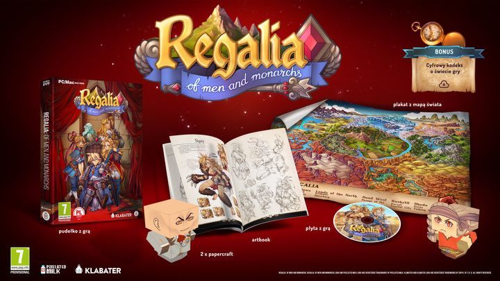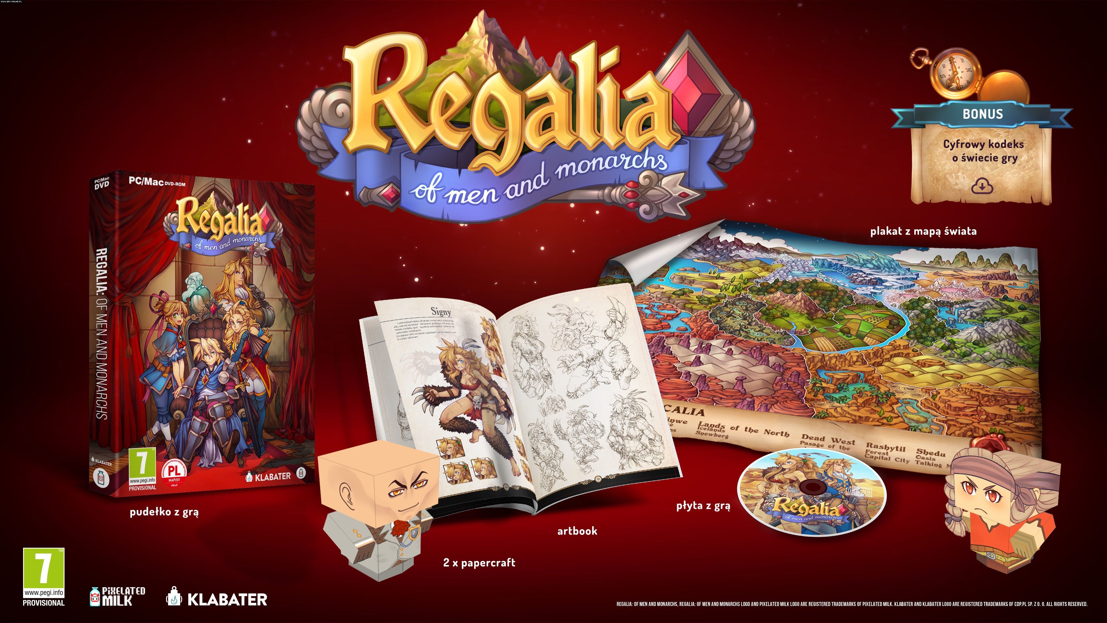 Regalia: Of Men And Monarchs jest do kupienia w wersji cyfrowej na platformach GOG (za 99,99 zł) i Steam (za 22,99 euro, czyli około 97 zł). Do sprzedaży trafiło również wydanie pudełkowe. Kosztuje ono około 69,99 zł i w jego skład wchodzą artbook, cyfrowy kodeks, plakat prezentujący mapę świata oraz dwa papierowe modele do samodzielnego złożenia.