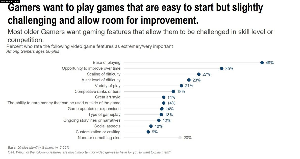 Większość graczy po pięćdziesiątce (69%) uznała też, że gry nie są projektowane pod użytkoników z ich przedziału wiekowego. Najpewniej chodzi tu o brak opcji dostępności, które pozwoliłyby dostosować rozgrywkę do oczekiwań i możliwość ludzi w starszych wieku. Ostatnio w tym zakresie dużo dobrego robi Sony.