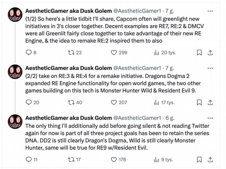 Fani słusznie zauważyli w komentarzach, że może to oznaczać, iż domniemany Resident Evil 9 zabierze nas do otwartego świata właśnie, dzięki technologii wykorzystanej przy Dragon’s Dogma 2. Takie wnioski nasuwają się też po sugestiach Dusk Golema, który wskazał, że Capcom ma w zwyczaju dawać zielone światło trzem nowym pomysłom naraz. Jako przykład podał RE 7, RE 2 i DMC V, które kolejno skorzystały z nowego wówczas silnika. Nowa „Dogma” ma jakoby iść w trójce z MH: Wilds i dziewiątym „Residentem”.