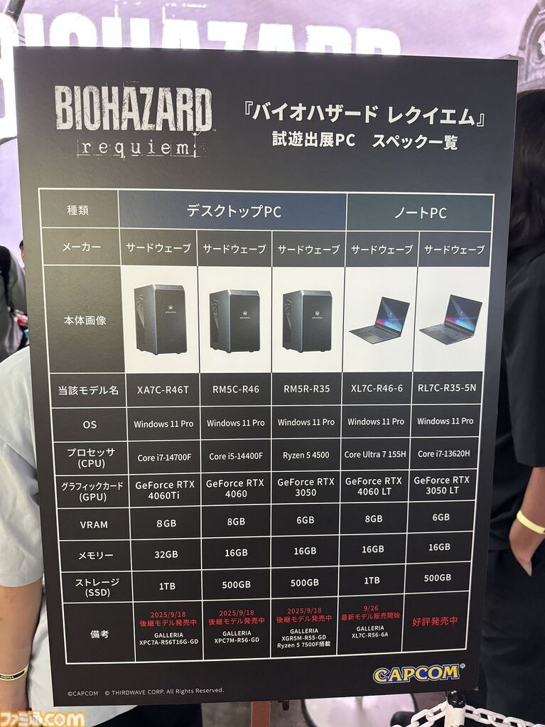 Jak donosi Famitsu, demo gry Resident Evil Requiem na Tokyo Game Show 2025 działało na komputerach z procesorami Intel Core i7-14700F, Intel Core i5-14400F, AMD Ryzen 5 4500, Intel Core Ultra 7 155H oraz Intel Core i7-13620H.