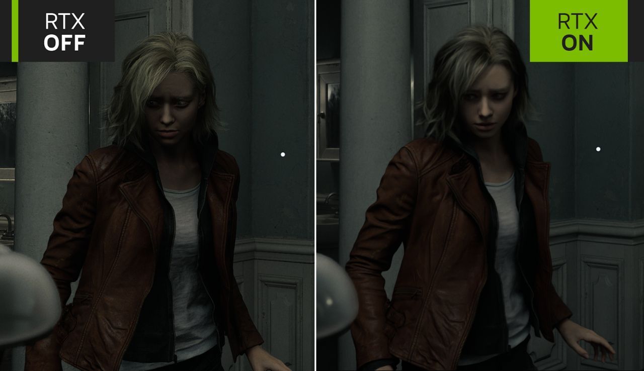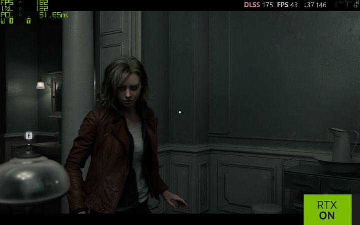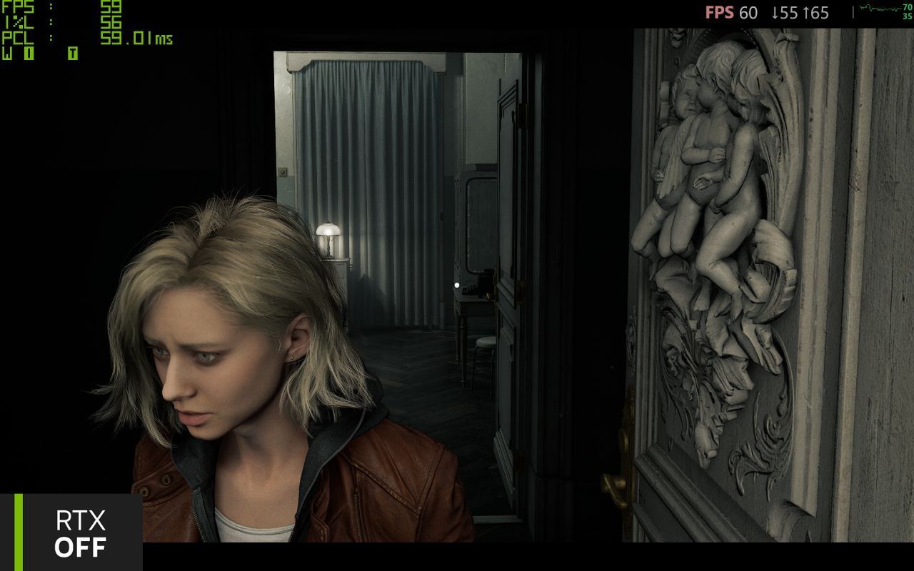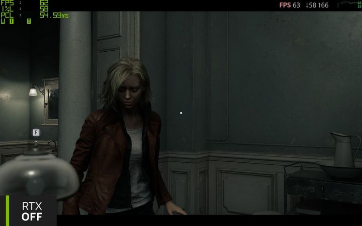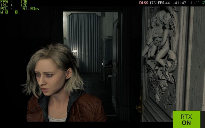 Co prawda do kwestii wydajności jeszcze odniosę się osobno, ale już teraz warto odnotować, że na zrzutach widać też odczyty aktualnego FPS i opóźnień (PCL). Ujęcia z wysokim śledzeniem promieni korzystają z natywnej rozdzielczości laptopa GIGABYTE Gaming A16 i podstawowego wygładzania krawędzi – zatem FHD z TAA. Ujęcia z aktywnym Path Tracingiem wykonano w tej samej rozdzielczości, ale z aktywnym DLSS Wydajność (transformacyjny model M), aktywnym DLSS Ray Reconstruction (autorski odszumiacz NVIDII) oraz z aktywnym DLSS Multi Frame Generation x4, co oznacza, że aktywny był też NVIDIA Reflex. Tymczasem na kolejnym ujęciu widać, że nowa technika renderowania włosów została stworzona z myślą o upscalerach, bo tylko dzięki niemu włosy faktycznie wyglądają naturalnie, wręcz filmowo. Po prawej widać też kolejne różnice w cieniowaniu drobnych detali geometrii (płaskorzeźba na drzwiach), a w trzecim planie zasłona zupełnie inaczej reaguje na światło i podłoga faktycznie zachowuje się jak lakierowana jodełka. Niby detale, ale zebrane razem w całość zupełnie zmieniają klimat sceny.