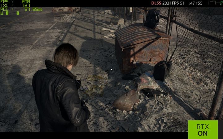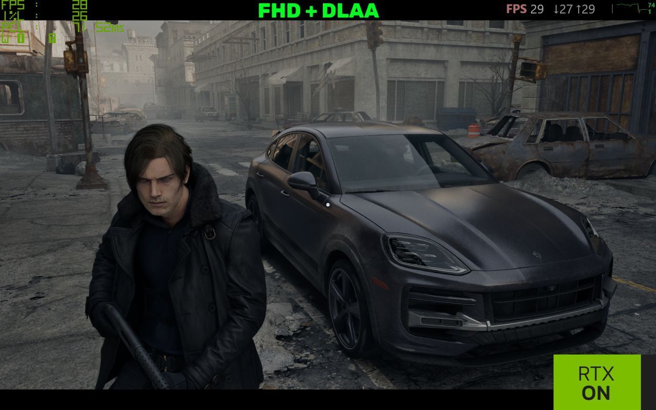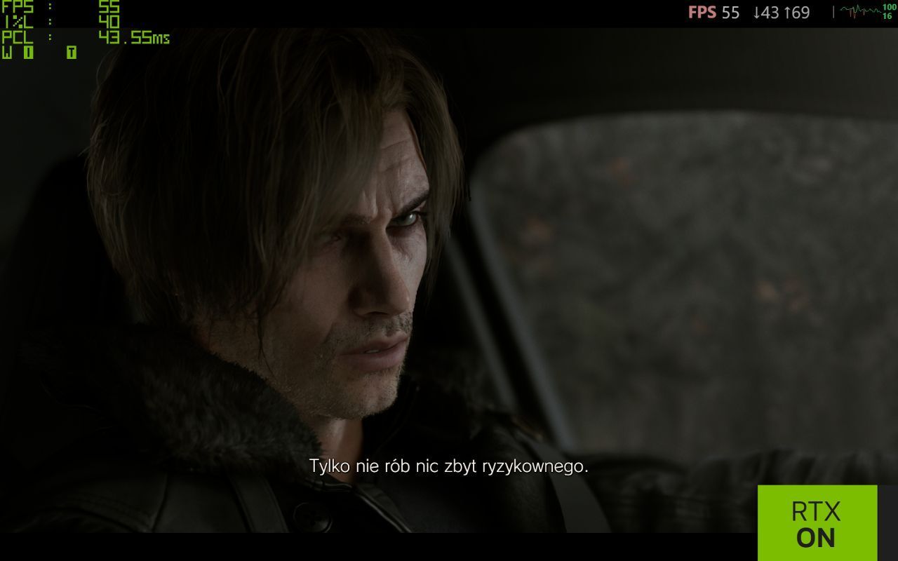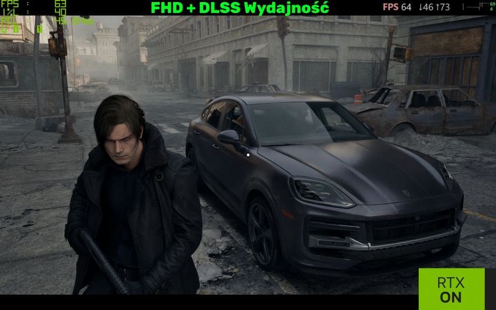 Z pewnością też zauważycie, że ujęcia bez Path Tracingu są ostrzejsze – owszem, tekstury są jednakowo ostre, niezależnie od ilości światła, które na nie pada, co oczywiście w takim półmroku wygląda nienaturalnie i „growo”. Początkowo myślałem, że przynajmniej po części jest to też kwestia używania wysokiego trybu upscalingu, ale w praktyce nie widzę różnic pomiędzy DLSS Jakość a Wydajność, nawet porównując zrzuty ekranu, a co dopiero w samej grze. Ba! W mojej opinii DLSS Wydajność prezentuje się lepiej od natywnej rozdzielczości z DLAA, gdy używamy Path Tracingu – zobaczcie na porównanie niżej – w szczególności znaczek „Porsche”, ale też twarz Leona i jego włosy – te znowu są zbyt „kanciaste” bez upscalingu. Ponad dwukrotnie wyższy FPS i 30 ms mniejsze opóźnienia również piechotą nie chodzą…