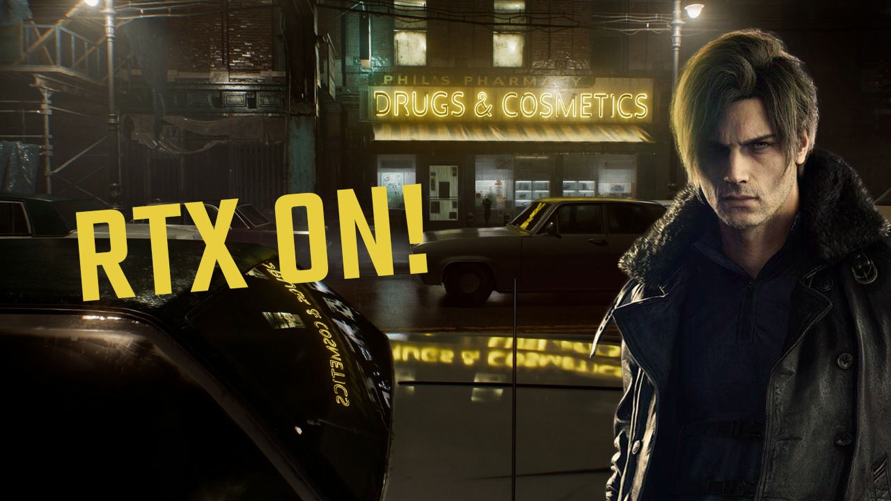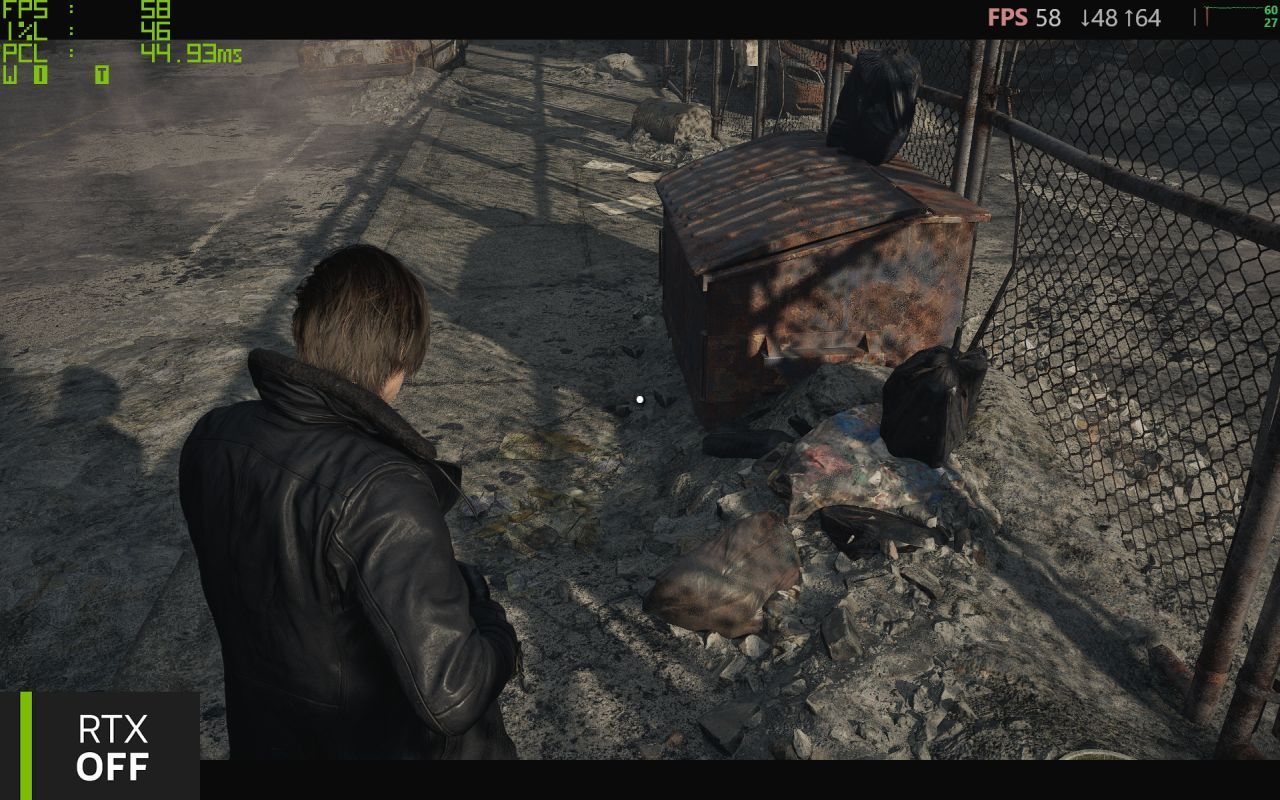 Tak samo zachowują się cienie słupów (ostre w prawym dolnym narożniku przy podstawie słupa i coraz bardziej rozmyte w stronę środka kadru), a nawet cienie budynków. Spójrzcie powyżej na cień Leona – jest na skraju cienia rzucanego przez bardzo oddalony (i wysoki) budynek i podczas grania z Path Tracingiem ten cień jest już bardzo miękki, ledwo widoczny. Tymczasem Ray Tracing przez całą jego długość zachowuje tę samą ostrość i cień wyraźnie nakłada się na ten rzucany przez Leona. W tych ujęciach wyśmienicie też widać, jak Path Tracing bierze pod uwagę barwę światła – w tej grze nie ma zmian pogody czy też pory dnia i ten kadr wygląda tak samo nawet po 30 minutach tkwienia w miejscu. Ale to z Path Tracingiem czuć po ciepłej aurze, że to jest zachód słońca, podczas gdy klasyczne śledzenie promieni tego nie uwzględnia i jest zielono.