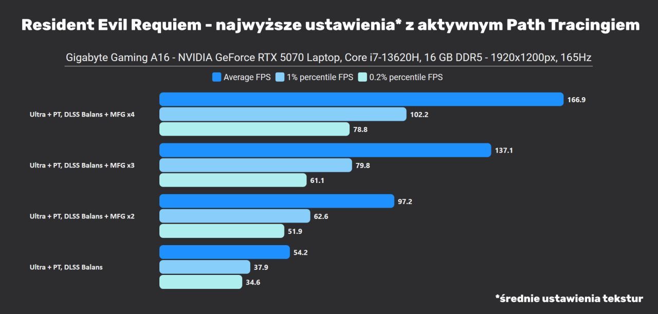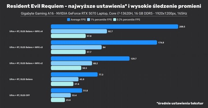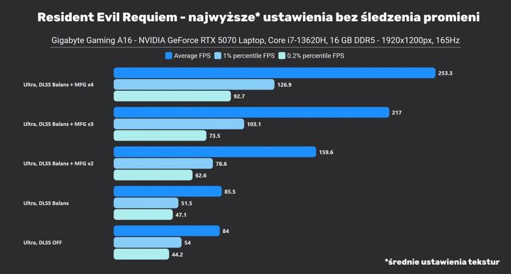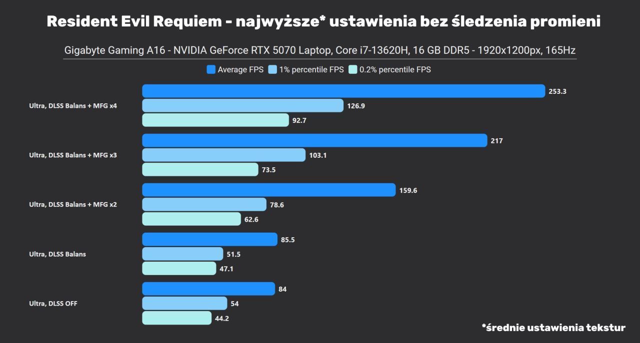 Jako że laptopa wyposażono w panel o przekątnej 16”, to rozdzielczość FHD prezentuje się na nim nawet lepiej niż 1440p na monitorach 27”. Niemniej to nadal dosyć mało pikseli, co utrudnia zadanie upscalerom, nawet tak dobrym jak NVIDIA DLSS 4.5 – mają mniej informacji, z których mogą rekonstruować obraz. Dlatego też na początek sprawdziłem, jak ten laptop radzi sobie na ustawieniach bez śledzenia promieni oraz z DLSS Balans (58% skalowania, co w praktyce oznacza, że silnik gry renderuje tylko 33% wszystkich pikseli względem natywnej rozdzielczości). Na rozgrzewkę testy w ustawieniach „słusznie minionej epoki”, czyli najwyższe, ale bez śledzenia promieni. Jedynie ustawienia tekstur gra zaproponowała, aby wybrać średnie – zrozumiałe dla karty z 8 GB VRAM, zwłaszcza że w FHD i tak nie widać różnicy. Zwróćcie uwagę na wyniki bez i z DLSS Super Resolution – to nie błąd na wykresie.