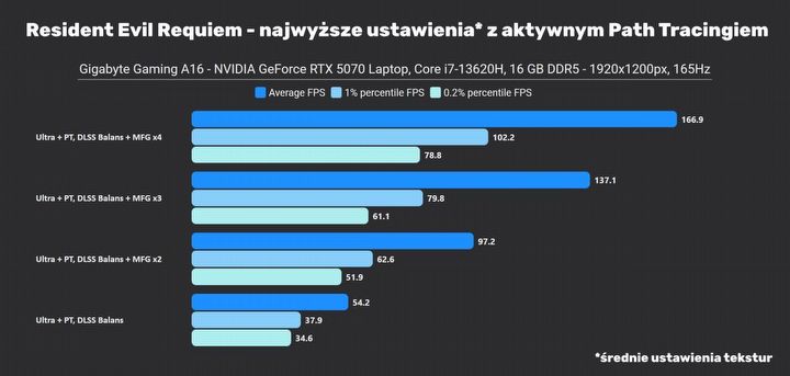 O tym, że Resident Evil Requiem jest grą bardzo dobrą, nikogo już chyba przekonywać nie trzeba, ale zdecydowanie warto podkreślić, że to jedna z tych gier, dla których warto ulepszyć nasz sprzęt albo kupić nowszego laptopa. Używany w testach GIGABYTE Gaming A16 sprostał testom, a jest to laptop, który kosztuje obecnie poniżej 6 tysięcy złotych. Nie jest to może sprzęt nastawiony na cichą pracę podczas grania, ale też nic się w nim nie przegrzewało, nawet podczas wielogodzinnej sesji.