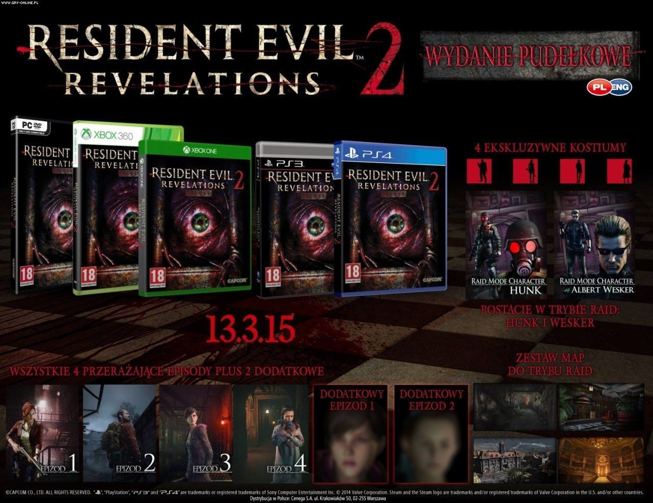 Firma Capcom podała daty premier poszczególnych epizodów Resident Evil: Revelations 2 oraz pudełkowego wydania gry. W Polsce tytuł trafi na sklepowe półki 13 marca 2015 roku w bogatej edycji standardowej.