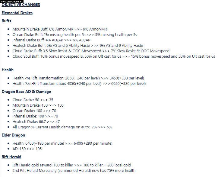 Również znajdujące się w LoL-u smoki nie umknęły patchowi. Poprawione zostały nie tylko zadawane przez nie obrażenia, ale ich regeneracja czy wzmocnienia, które otrzymujemy po ich zabiciu.