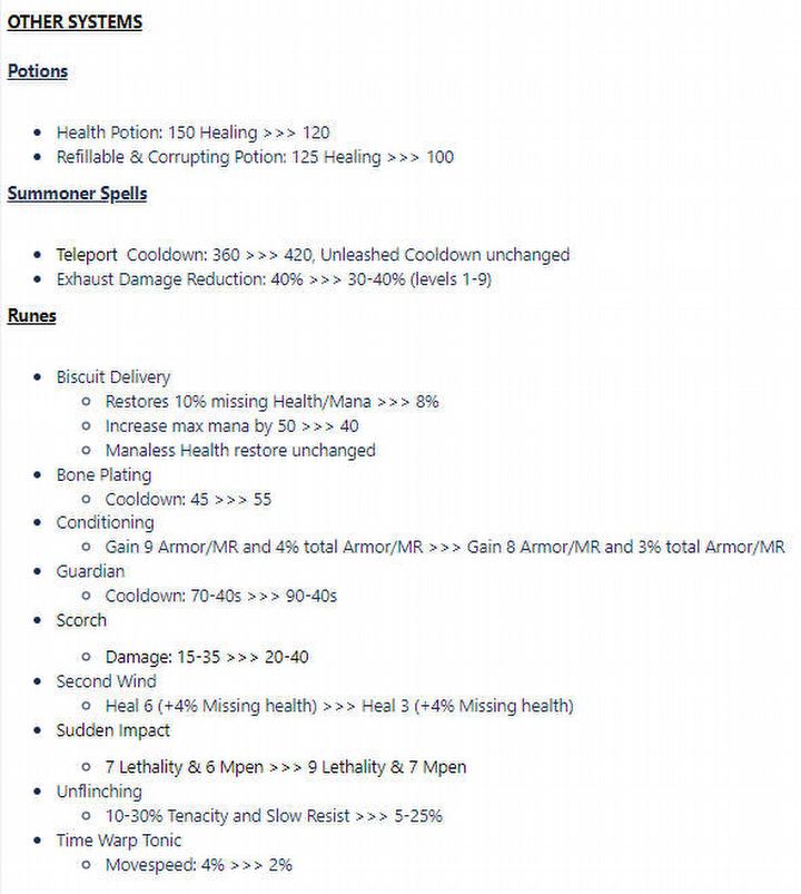 Poza zmianami w bohaterach Riot postanowił też dopracować mikstury, runy oraz czary przywoływacza. Największą zmianą jest zwiększenie czasu odnowienia teleportu, co będzie trwać o minutę dłużej (z 360 sekund do 420).
