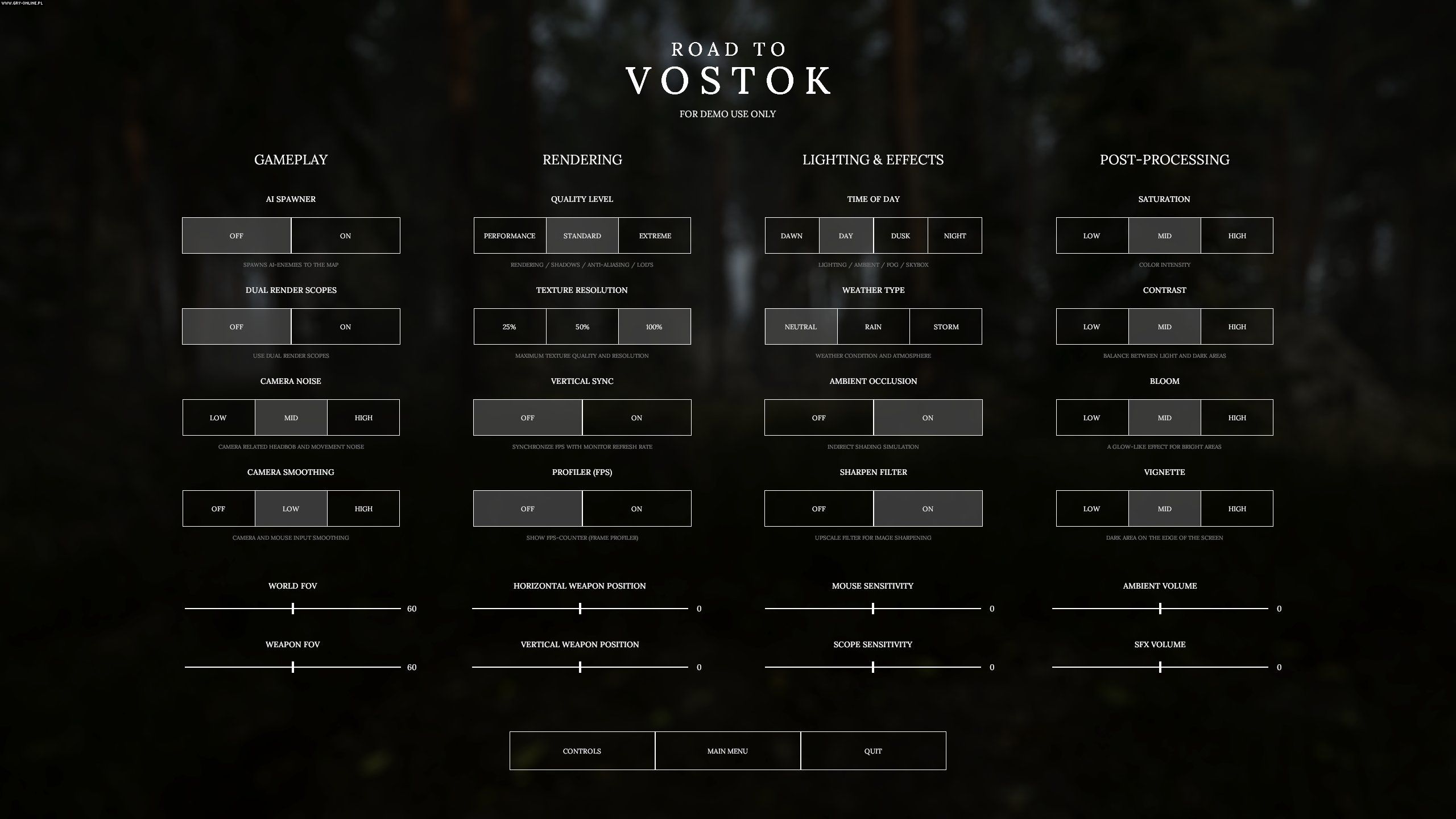Udostępniono również screen menu dema, który możecie zobaczyć poniżej. Wynika z niego, że będziemy mogli nie tylko konfigurować ustawienia graficzne (w tym, co zawsze cieszy, FoV, czyli szerokość pola widzenia), ale również ustawiać pory dnia czy pogodę.
