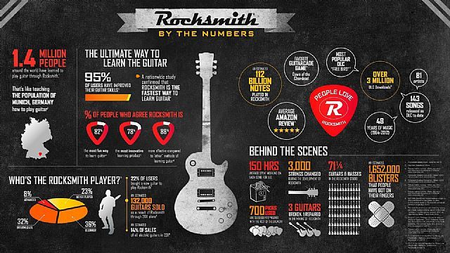 Firma Ubisoft przygotowała specjalną infografikę, na której umieszczono najciekawsze statystyki dotyczące Rocksmith, muzycznej gry studia z siedzibą w Montrealu. Jak wynika z udostępnionych informacji, marka francuskiego koncernu sprzedała się od premiery w nakładzie 1,4 miliona egzemplarzy, a większość nabywców stwierdziło, że dzięki tej produkcji nauczyło się lepiej grać na gitarze (prawdziwej, bo, w przeciwieństwie do serii Guitar Hero, w Rocksmith jest właśnie taka wymagana).