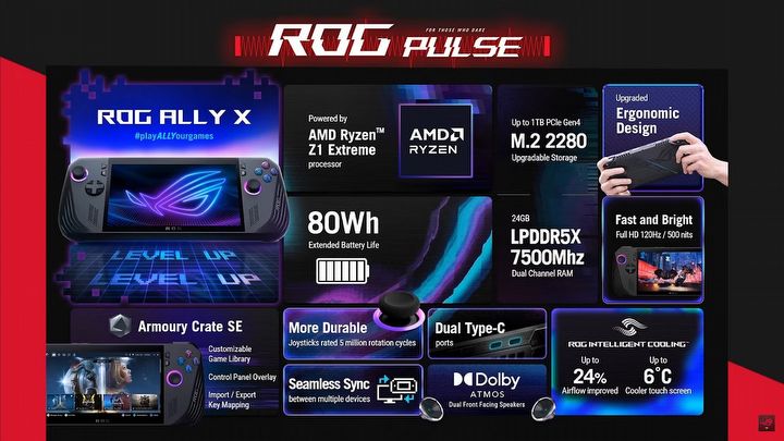 Wczorajsze przecieki potwierdziły się. Konsola posiada dwukrotnie większą baterię o pojemności aż 80 Wh. Dla porównania konkurencyjny Steam Deck posiada baterię o pojemności 50 Wh. Zwiększyła się także ilość RAM-u. ROG Ally X jest wyposażony w 24 GB pamięci LPDDR5X o taktowaniu 7500 MHz.
