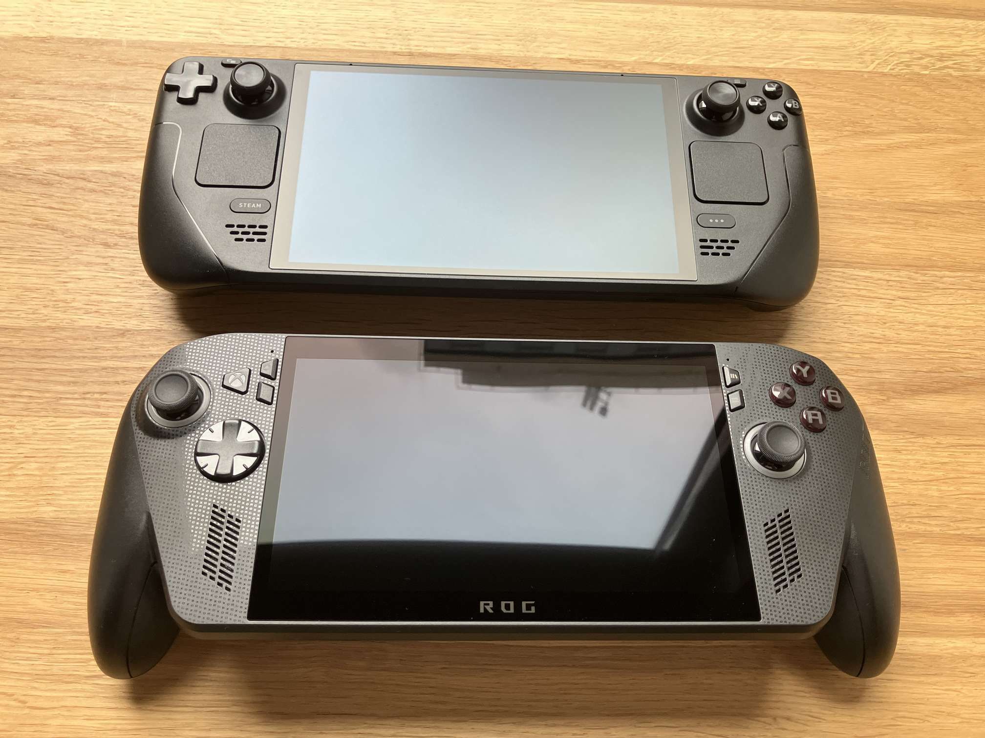 W przypadku Steam Decka dużą przewagą jest ekran OLED, pomimo niższej częstotliwości odświeżania. Mimo wszystko spora różnica w cenie obu urządzeń powoduje, że w teorii ASUS powinien oferować ekran OLED w standardzie, a jednak wciąż stosuje w swoich przenośnych konsolach panele LCD. W przypadku urządzeń mobilnych OLED sprawdza się lepiej od LCD i daje po prostu lepsze wrażenia z użytkowania. Dodatkowym atutem po stronie sprzętu Valve są gładziki dotykowe, pozwalające na symulowanie ruchów myszy. Przekłada się to na większą dokładność w grach i jest zbawienne w niektórych gatunkach, np. w strategiach. Niestety, jego „zielony” konkurent jest ich pozbawiony.