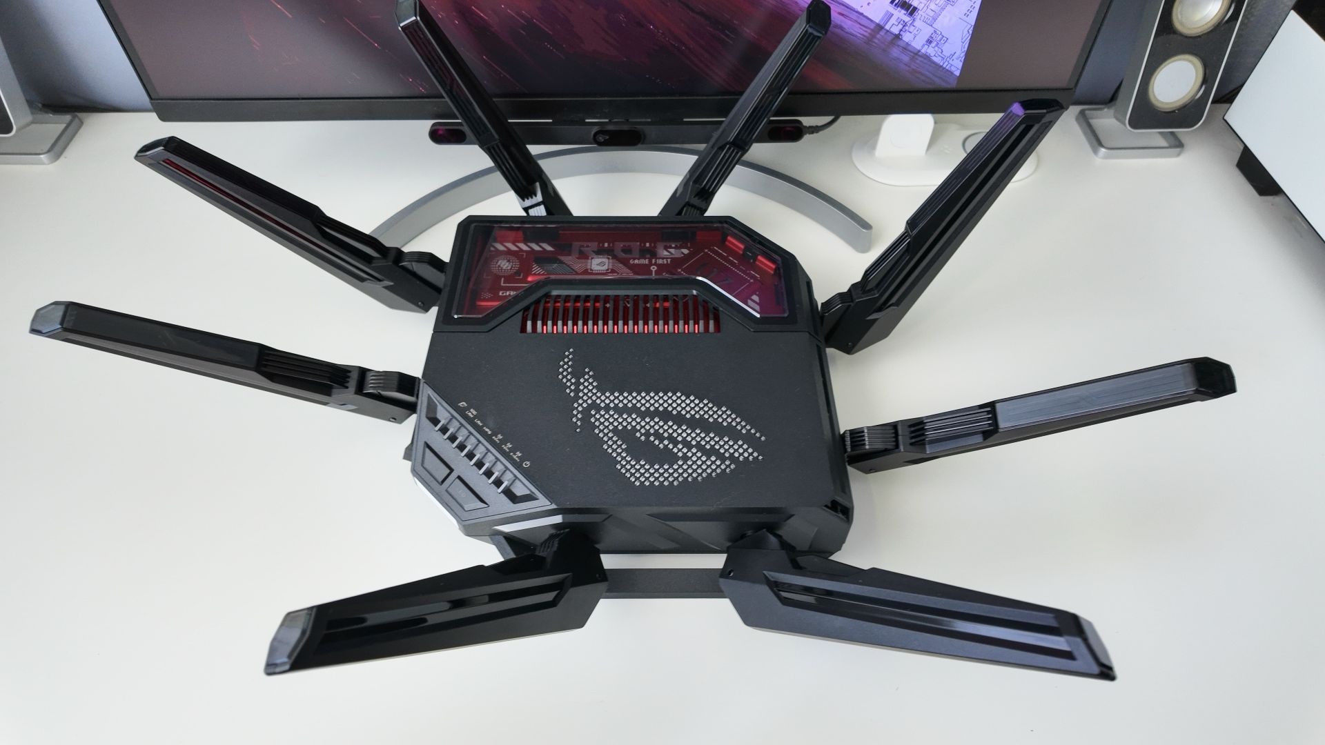 Asus ROG Rapture GT-BE19000 zaskakuje od pierwszego kontaktu. Przychodzi w wielkim pudełku, zapakowany jak gamingowy laptop klasy premium. Zresztą pod względem wymiarów i wagi (2 kg!) niewiele mu ustępuje. Po rozpakowaniu jest jeszcze ciekawiej – masywny, uzbrojony w grube anteny z każdej strony, przypomina gigantycznego pająka albo futurystycznego robota z gry SF.