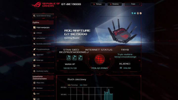Poza lepszym zasięgiem i prędkością Asus ROG Rapture GT-BE19000 resztę swoich atutów odkrywa po zalogowaniu się na konto na stronie asusrouter.com – to samo da się też zrobić w mobilnej apce. Ilość rzeczy, jakie można tam skonfigurować, robi wrażenie – o wielu z nich dowiedziałem się dopiero przy okazji tego testu. Sporo ustawień związanych jest bezpośrednio z grami, jak na router gamingowy przystało. Jednym kliknięciem opcji Game Boost możemy więc przyspieszyć cały ruch sieciowy routera związany z grami. A jeśli to za mało, to mamy jeszcze bezpośredni dostęp do usługi WTFast, która jest jakby VPN-em łączącym nasz komputer z serwerem gry, korzystając z najkrótszej, najszybszej drogi – wymaga to jednak opłacenia subskrypcji. W panelu przekierowywania portów Open NAT znajdziemy sporo gotowych profili dla najpopularniejszych gier sieciowych, choć tutaj przydałaby się mała aktualizacja tytułów.