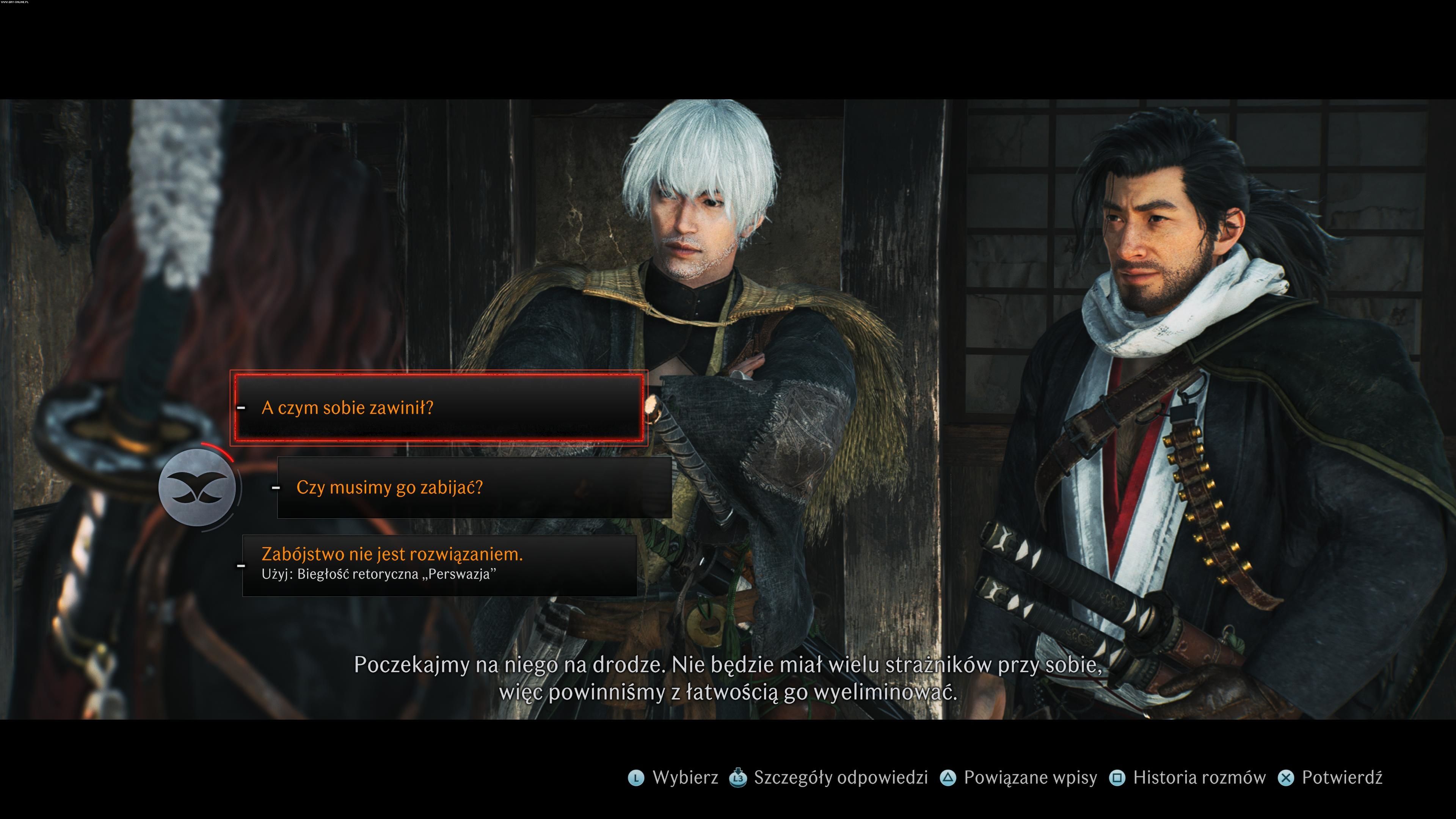 Opowiedzenie się za szogunatem lub przeciwko niemu rzeczywiście wpływa na to, jakich bossów spotkamy i ile razy się z nimi zmierzymy, gdyż twórcy pozwalają poznać przedstawicieli obu frakcji. Ucząc się perswazji i kłamania, faktycznie otrzymujemy dostęp do specjalnych opcji dialogowych, które niejednokrotnie są tymi najlepszymi w danej sytuacji. Jeśli jednak chodzi o rozmowy jako takie, tutaj wybór bardzo często bywa „kosmetyczny”, podobnie jak ten z początku gry, gdy decydujemy, czy chcemy przemierzać Japonię jako mężczyzna, czy jako kobieta.