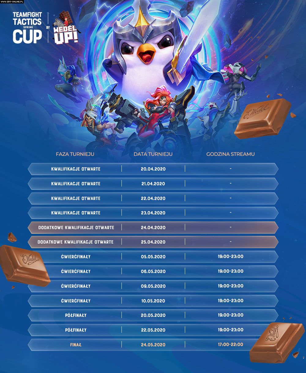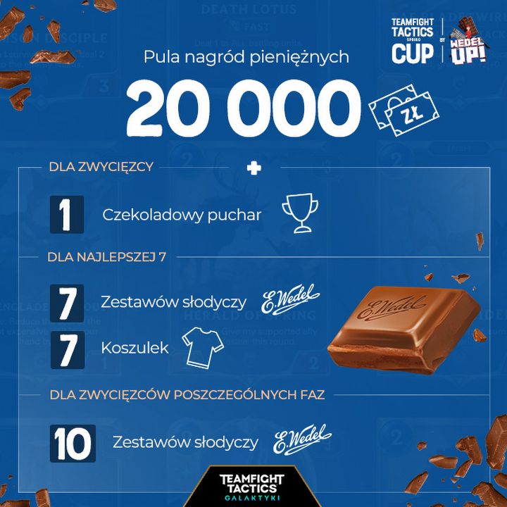Trzymamy kciuki za wszystkich zawodników! Szczegółowe informacje wraz z regulaminem turnieju znajdziecie na naszej stronie. #zostanwdomu i śledź pojedynki zawodników w słodkim turnieju Teamfight Tactics Spring CUP by Wedel Up!