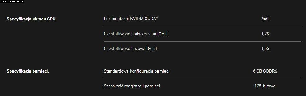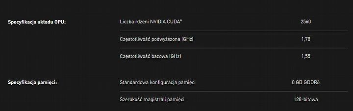 Cena GPU zupełnie nie idzie w parze z jego wydajnością. Od momentu pojawienia się pierwszych plotek na temat RTX-a 3050 wiadomo było, że będzie on słabszy, ale tańszy. Teraz zgodne z prawdą zostaje jedynie pierwsze z określeń. Tak prezentuje się specyfikacja karty wg oficjalnych danych: