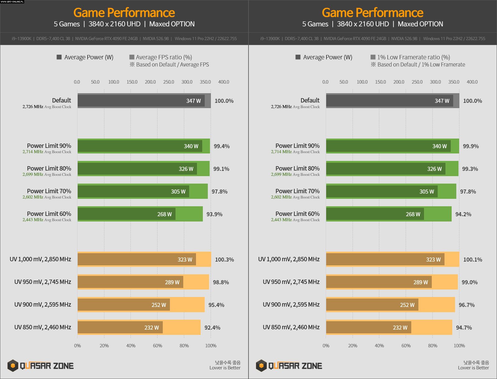 QuasarZone przetestował flagowca zielonych pod kątem wydajności z fabrycznym limitem mocy oraz po undervoltingu, pokazując, że 4090 może być niezwykle oszczędna. Przed premierą straszono wysokim TDP na poziome 450 W, ale w rzeczywistości karta rzadko osiąga taki pobór prądu.