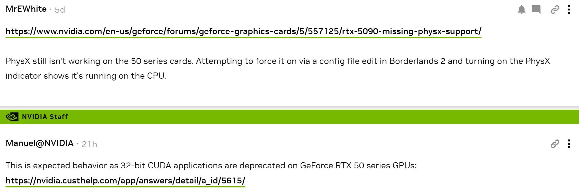 To nie są plotki, bo brak obsługi 32-bitowego PhysX-a na RTX-ach 50 potwierdziła Nvidia na swoim forum (vide VideoCardz), gdy jeden z internautów zgłosił problem, myśląc, że pojawił się błąd w sterownikach. Okazuje się jednak, że działanie jest celowe. Komentując doniesienia w mediach społecznościowych, gracze sarkastycznie stwierdzają, że cała nowa generacja GPU od Nvidii to najlepsza reklama dla RTX-a 4080 Super.