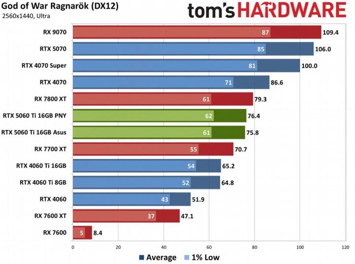 Jeśli chcielibyśmy go porównać do układu od AMD to zbliżone osiągi oferuje RX 7700 XT. Dla przykładu w grze God of War Ragnarok, karta jest w stanie wygenerować około 48 klatek w rozdzielczości 2K. Jej poprzednik osiąga maksymalnie 40 FPS-ów.