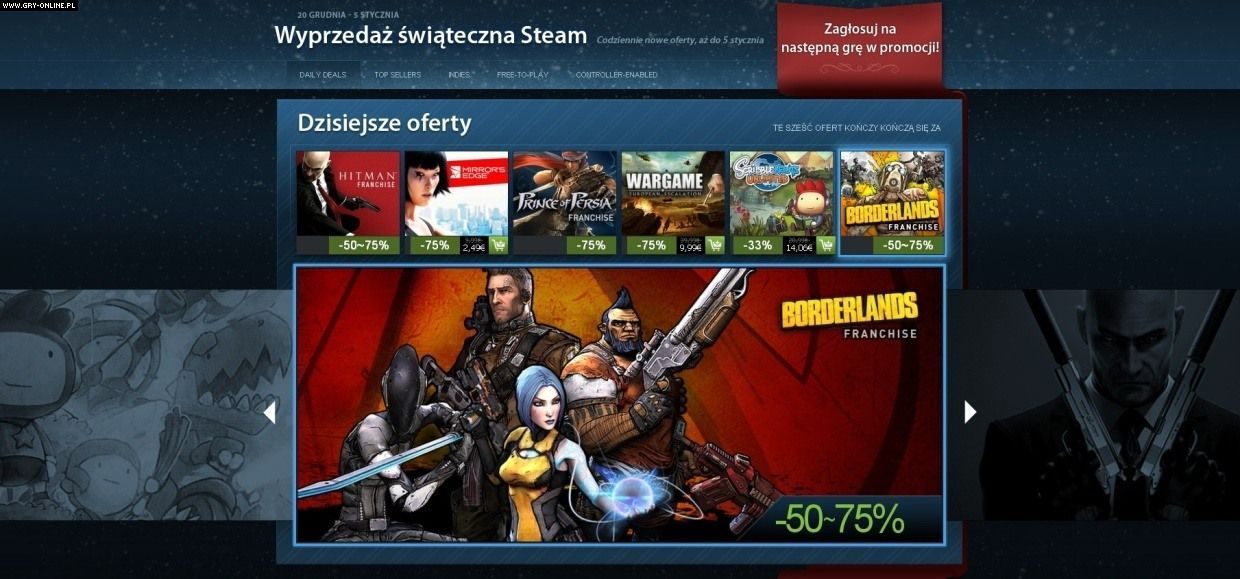 Od dziś do 5 stycznia możemy ponownie wprawić w ruch nasze karty kredytowe – godzinę temu rozpoczęła się świąteczna wyprzedaż na platformie firmy Valve. Na pierwszy ogień poszły obniżki cen tytułów z serii Borderlands, Hitman, Prince of Persia, a także wielu pojedynczych produkcji, w tym Mirror’s Edge, Scribblenauts Unlimited oraz Wargame: European Escalation.