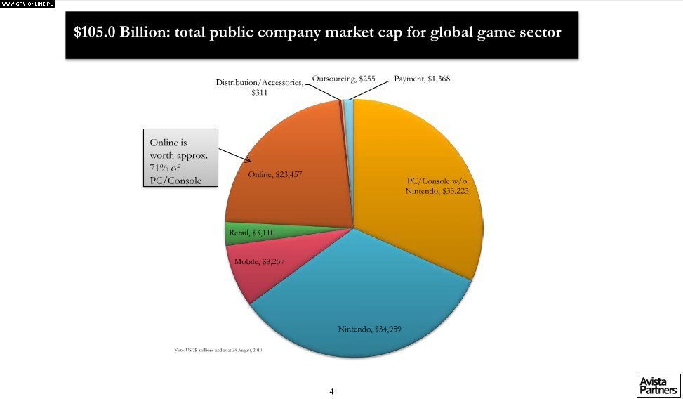 Podczas konferencji Edinburgh Interactive, która miała miejsce w tym tygodniu w Wielkiej Brytanii, Paul Heydon, zajmujący się inwestycjami bankier z niezależnego banku Avista Parners, przedstawił prezentację, w której oszacował ogólną wartość rynkową branży gier wideo - na sumę od 100 do 105 miliardów dolarów.
